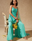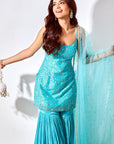 Rawsilk Handembroidered Kurta With Flared Pallazo Pants In Georgette And Tulle Dupatta