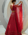 Red glassbeads and zari encrusted organza lehenga paired with intricately embellished deep v neck blouse and soft tulle dupatta
