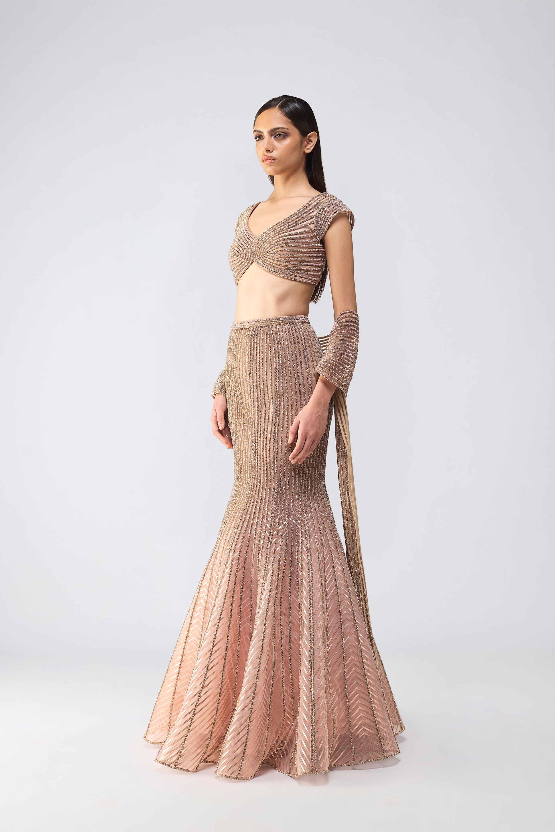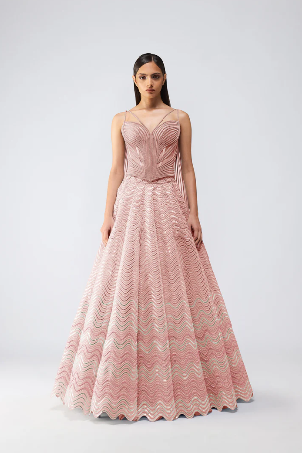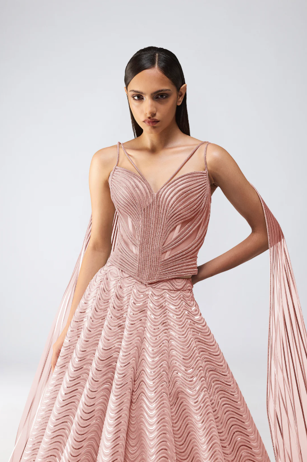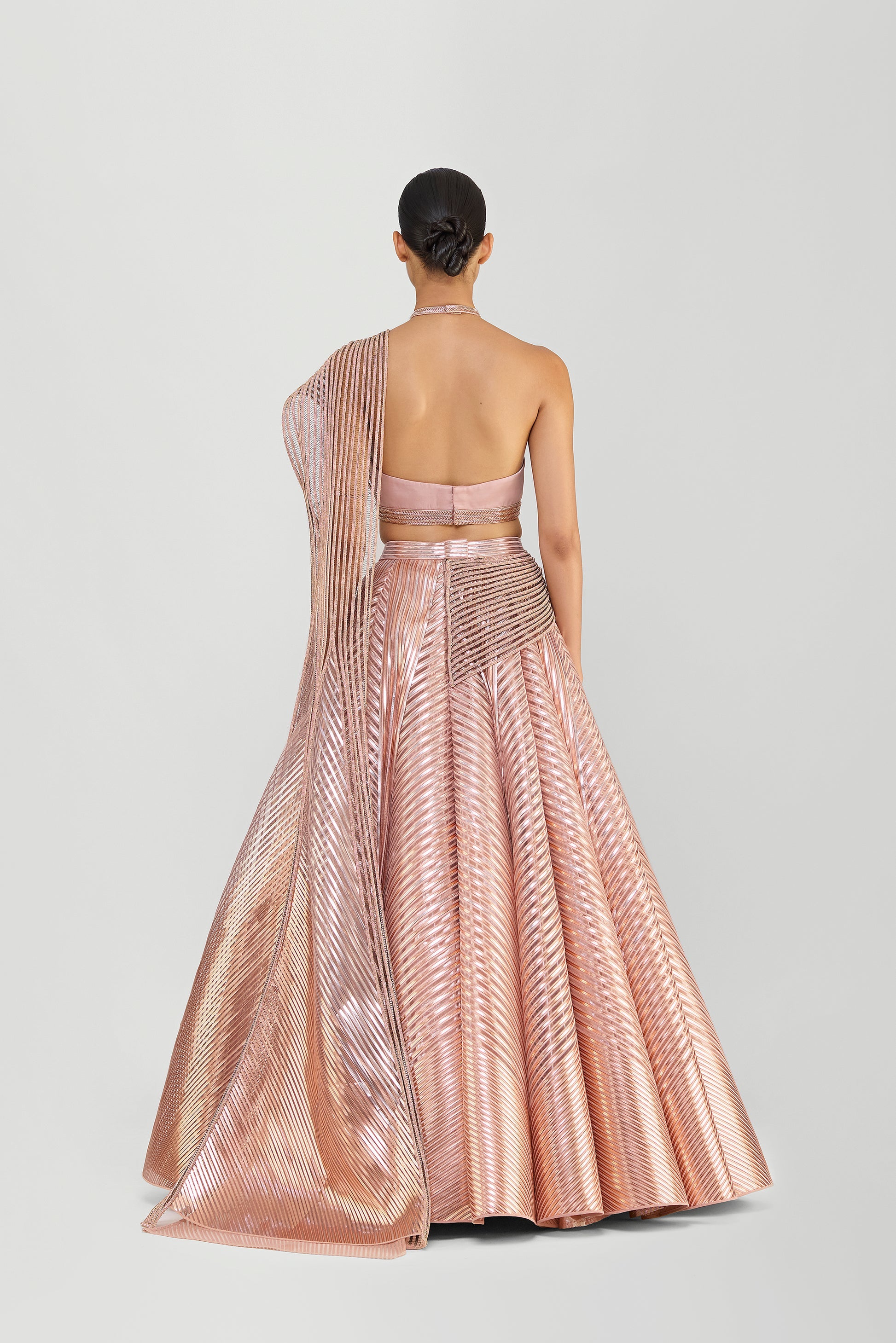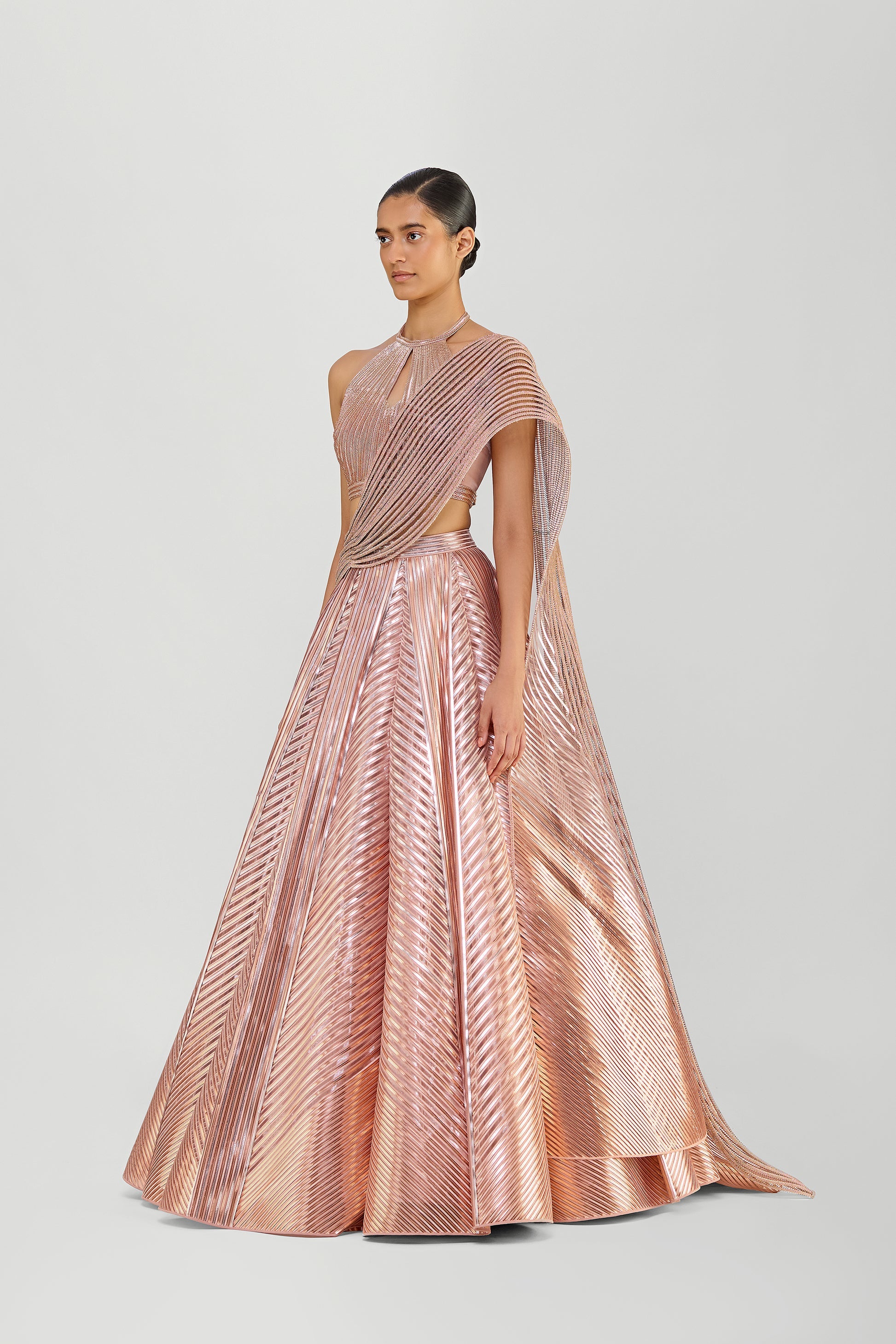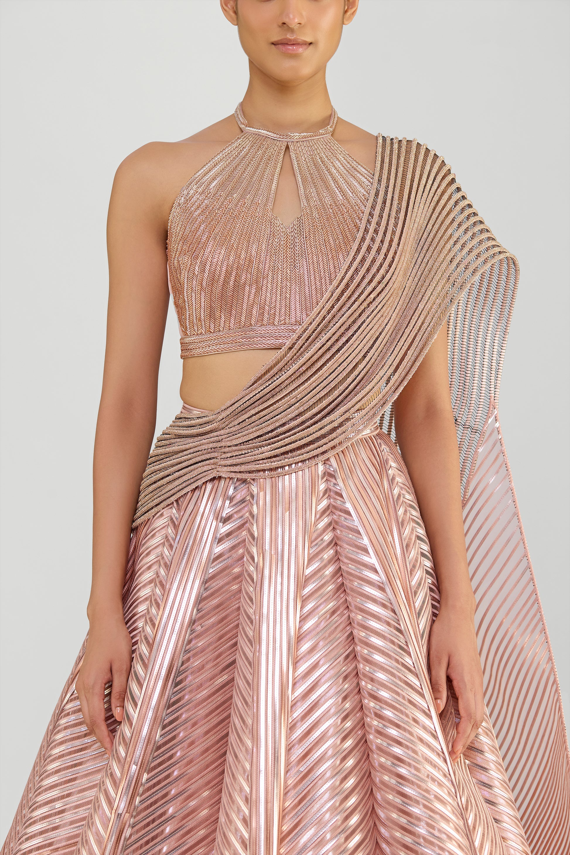 Metallic Fluted Tulle Skirt With A Beaded Halter Top And Crystalvein Drape - Rose