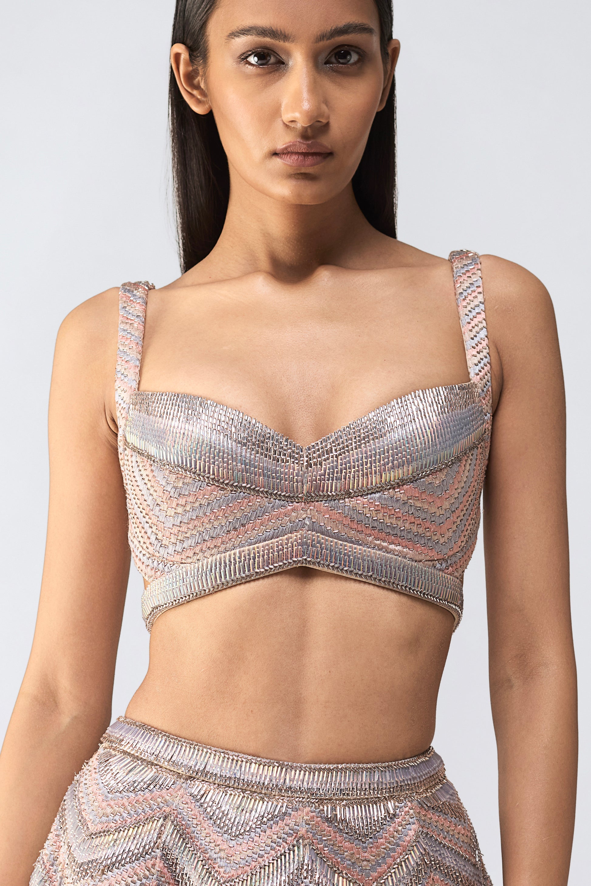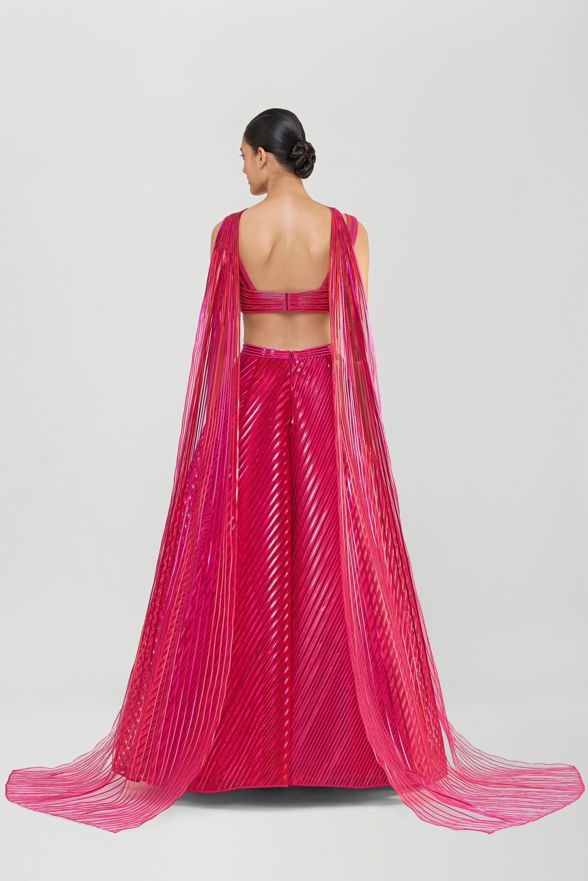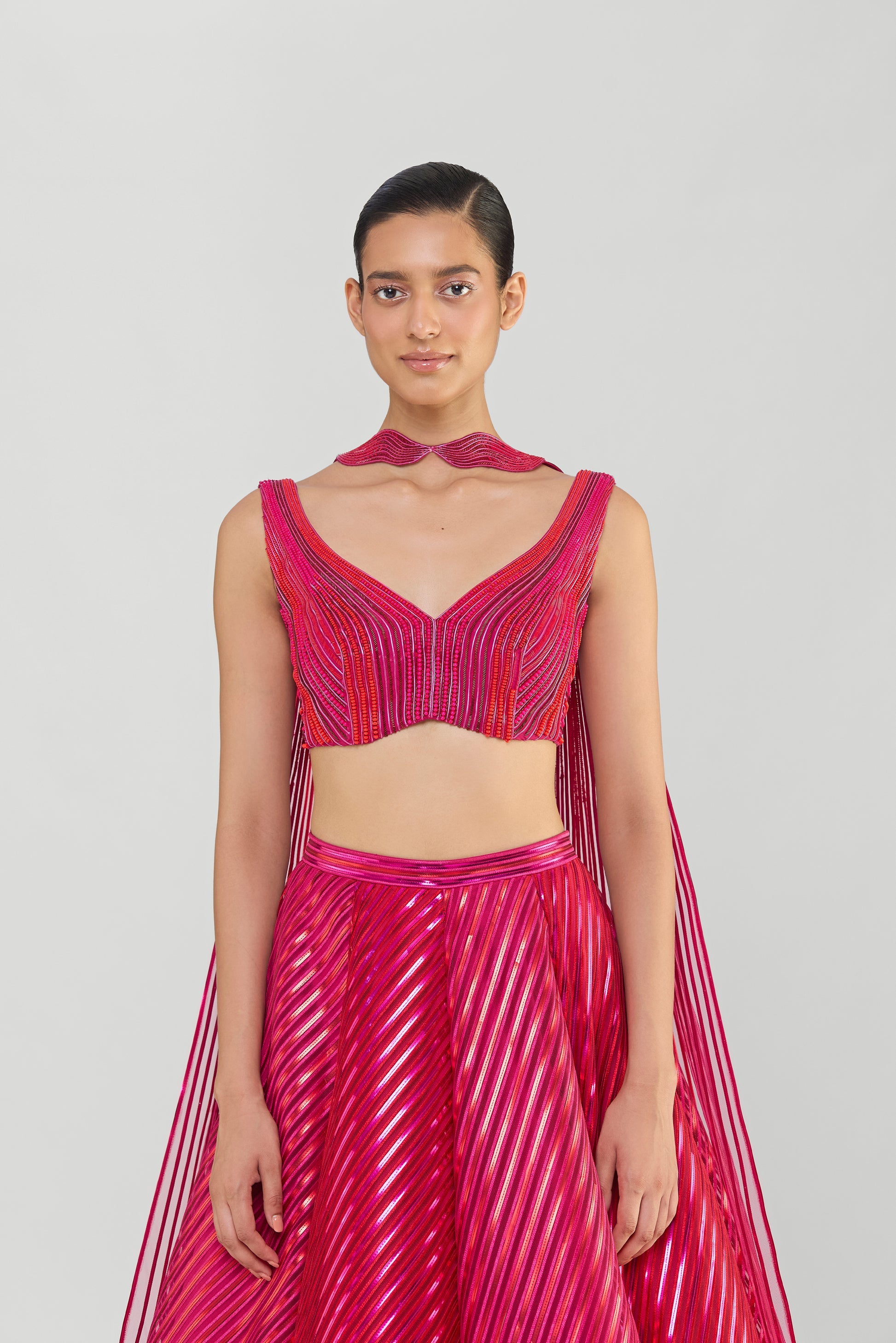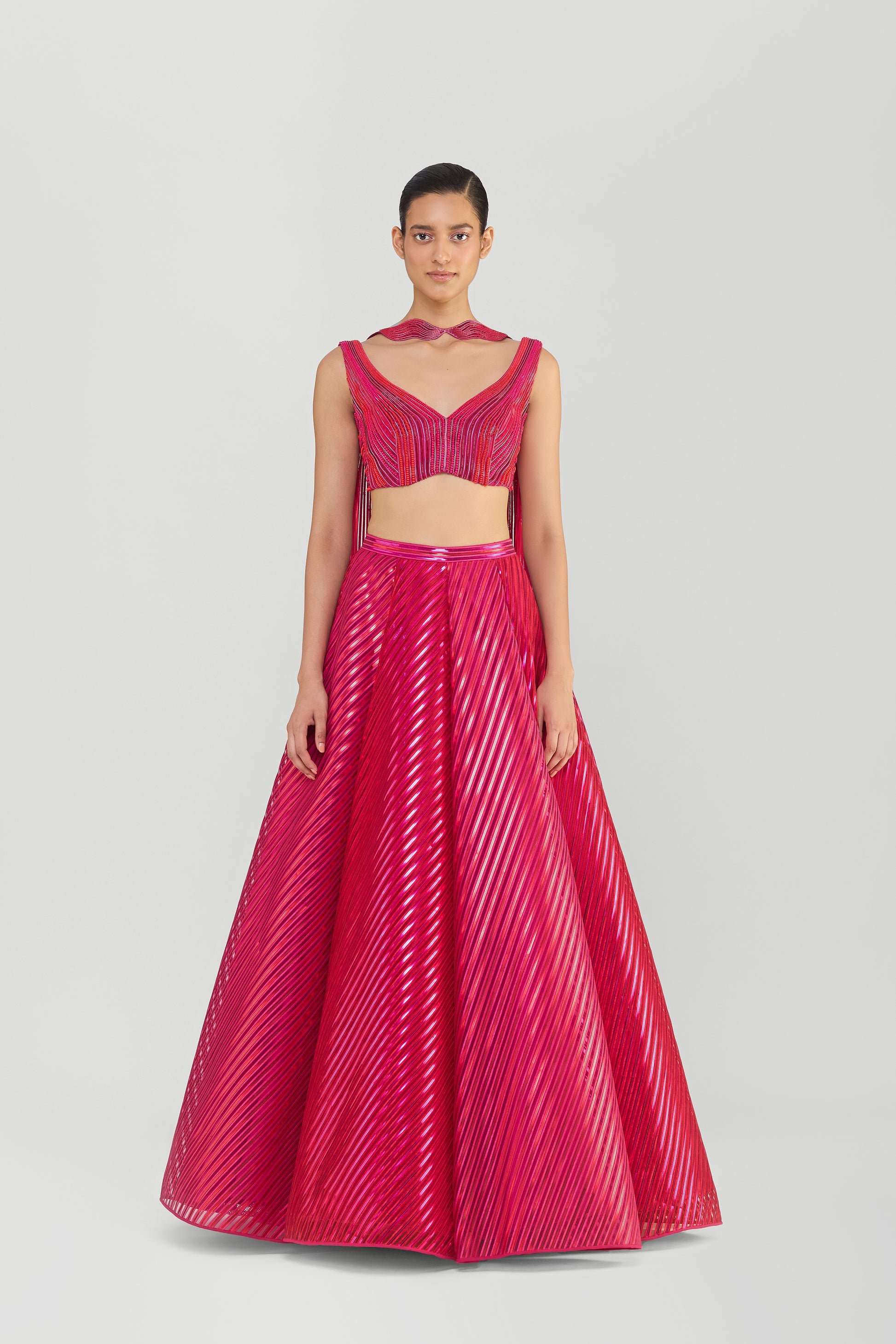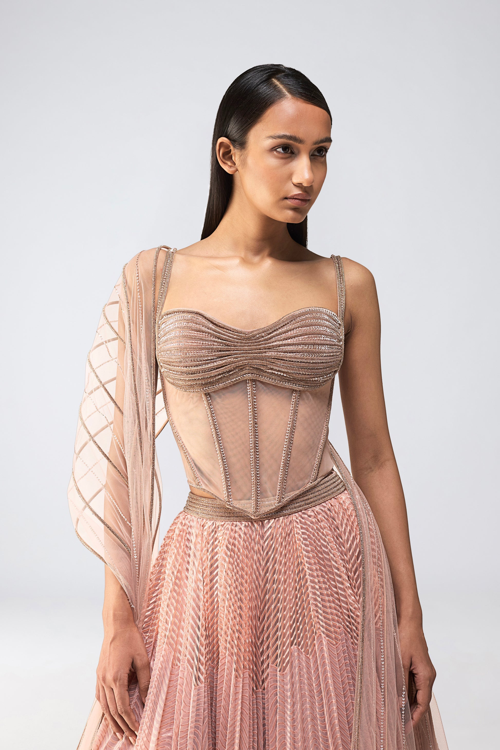 Metallic Fluted Tulle Skirt With A Beaded Halter Top And Crystalvein Drape - Rose