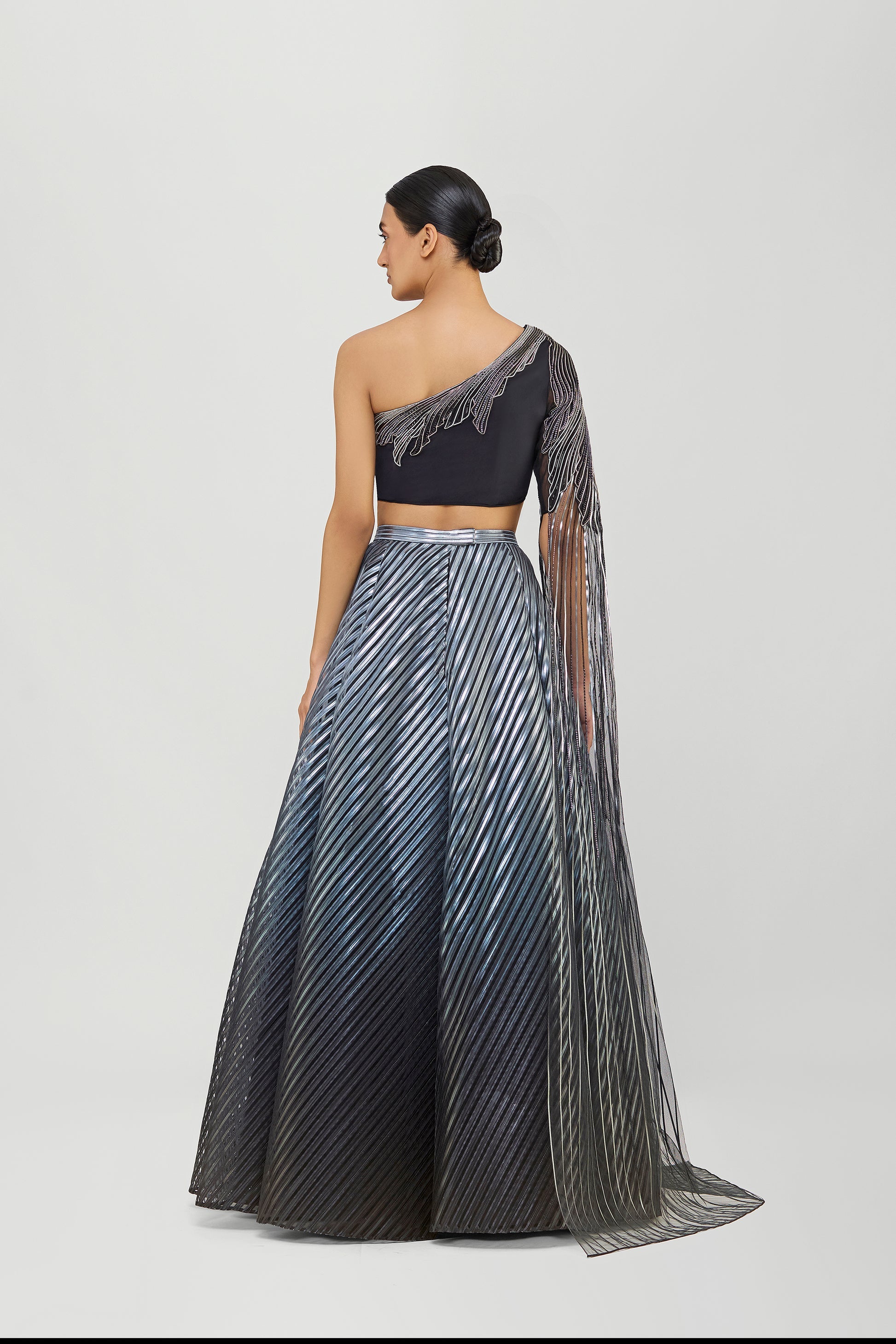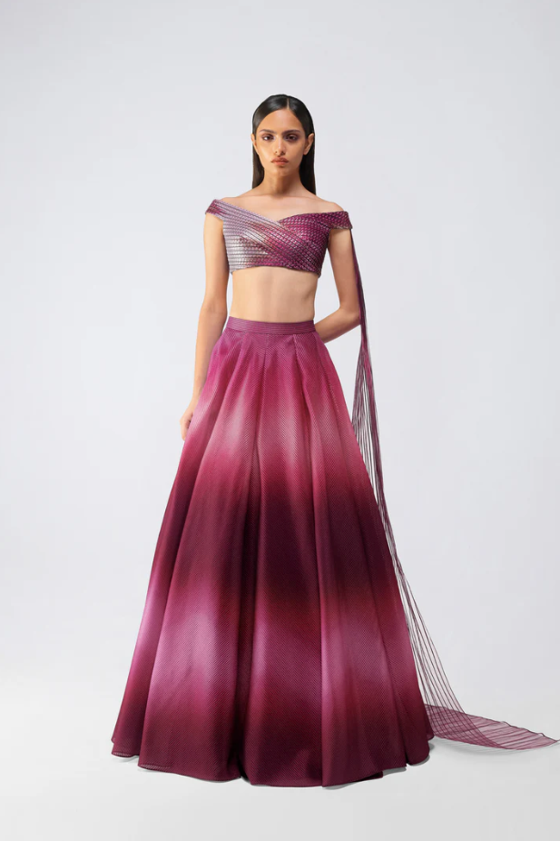 Metallic Glitch Top With Drape And Ombre Skirt