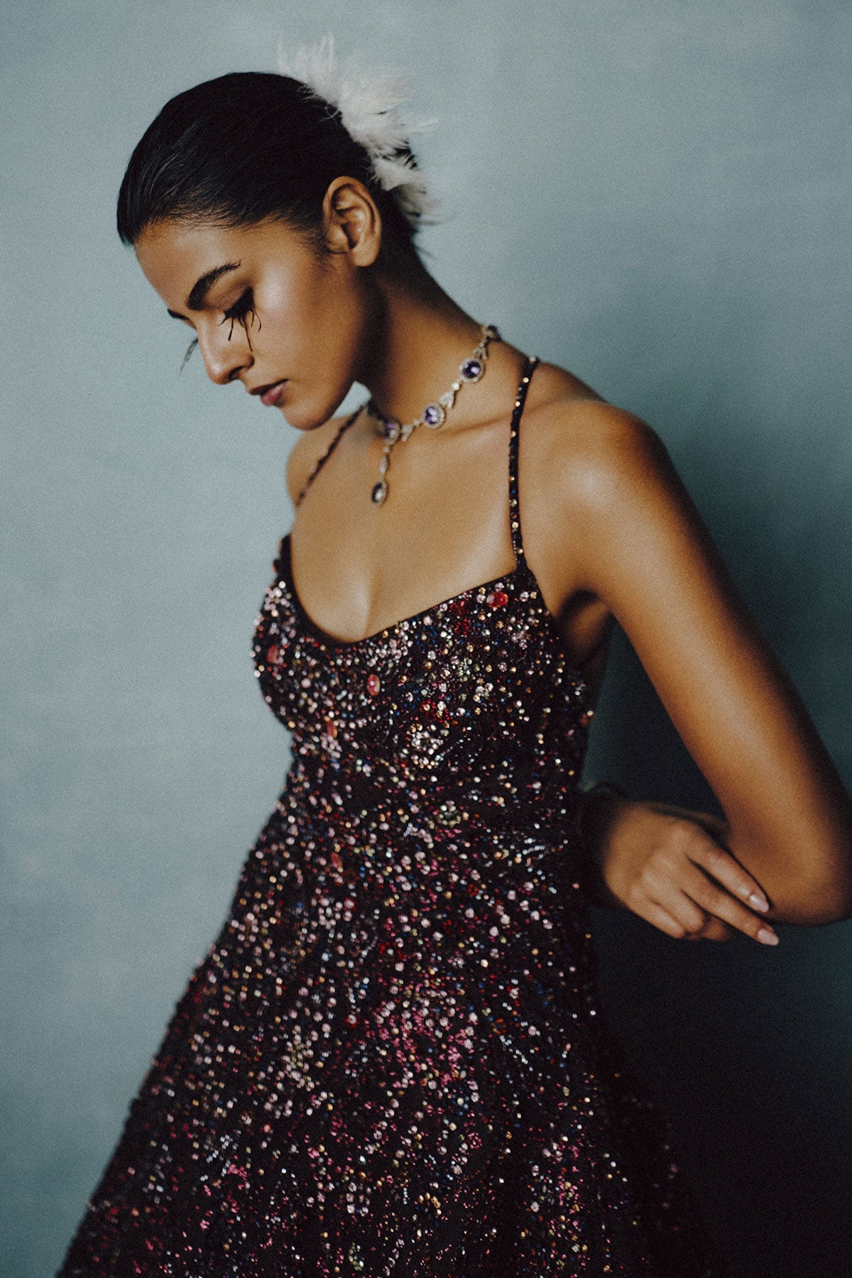 Luna Noir Beaded Slit Gown
