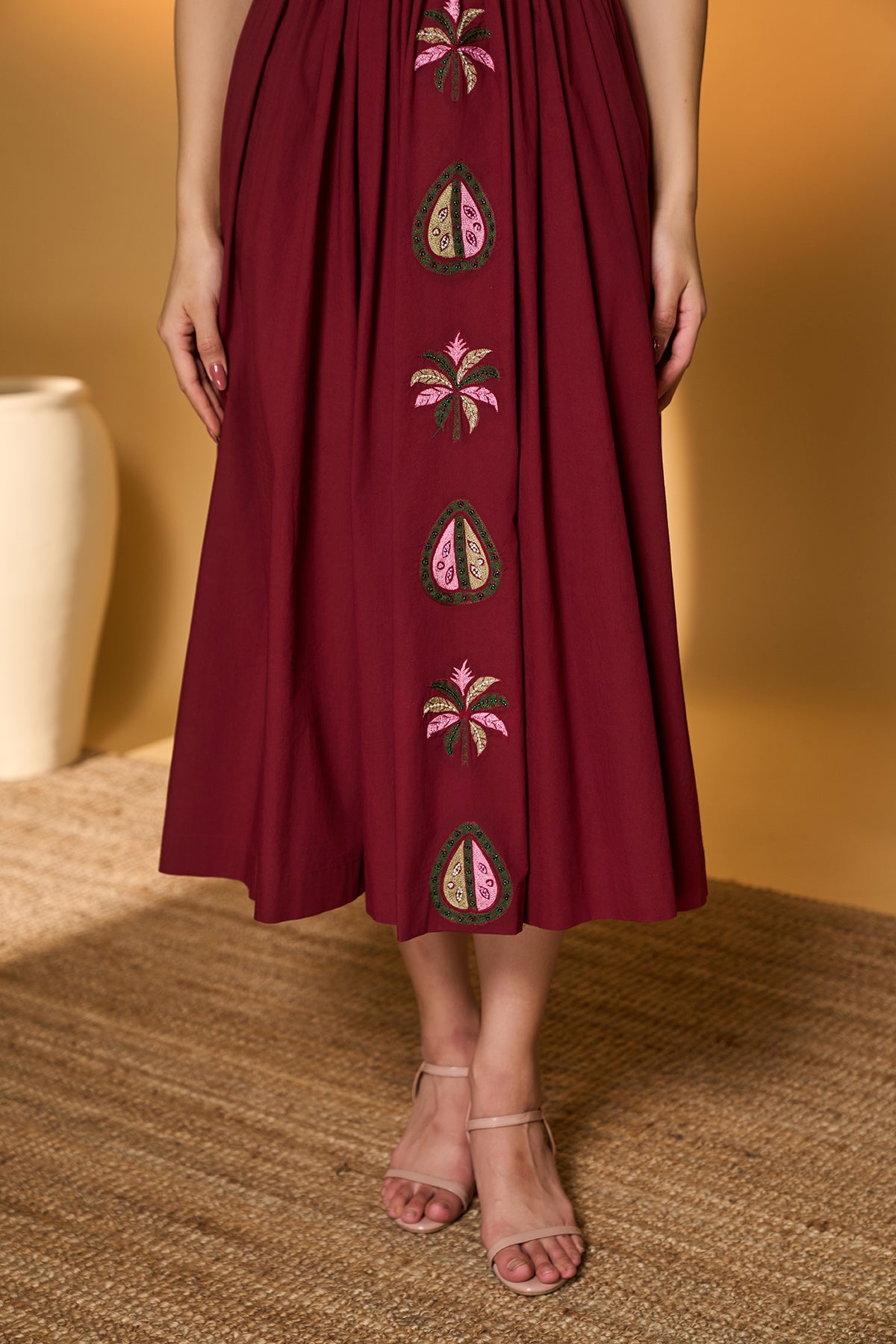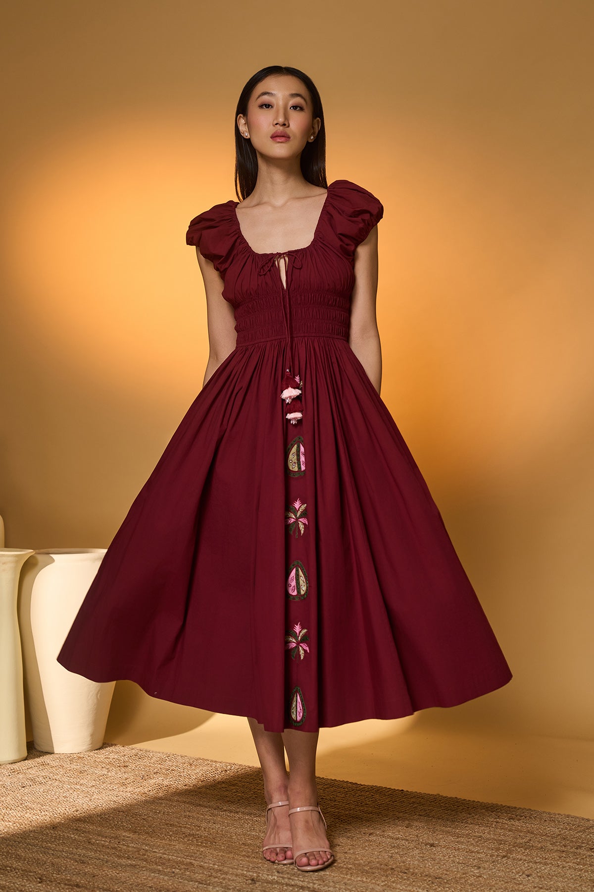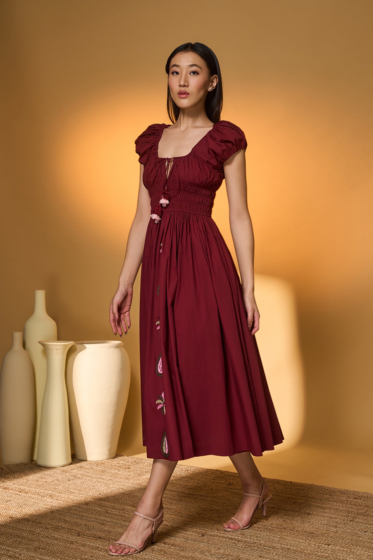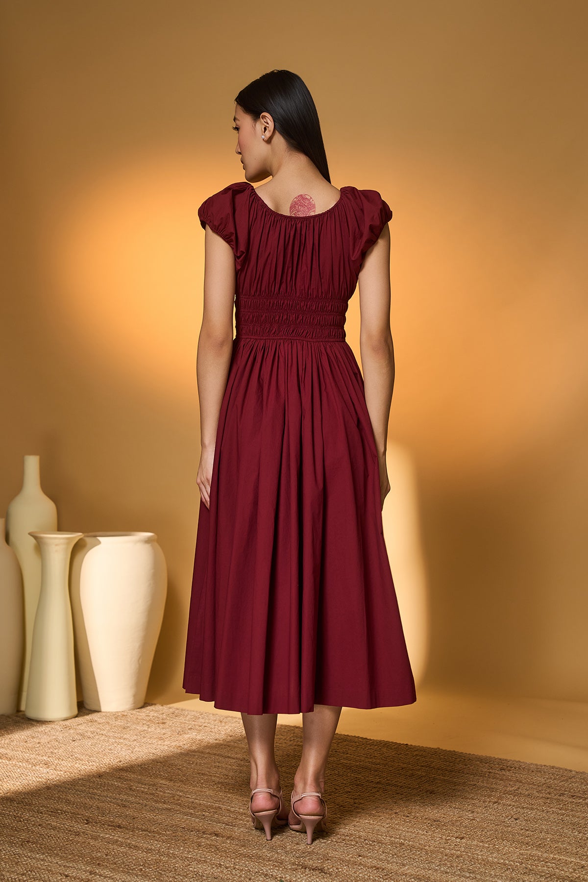 Maroon Smocked Midi Dress