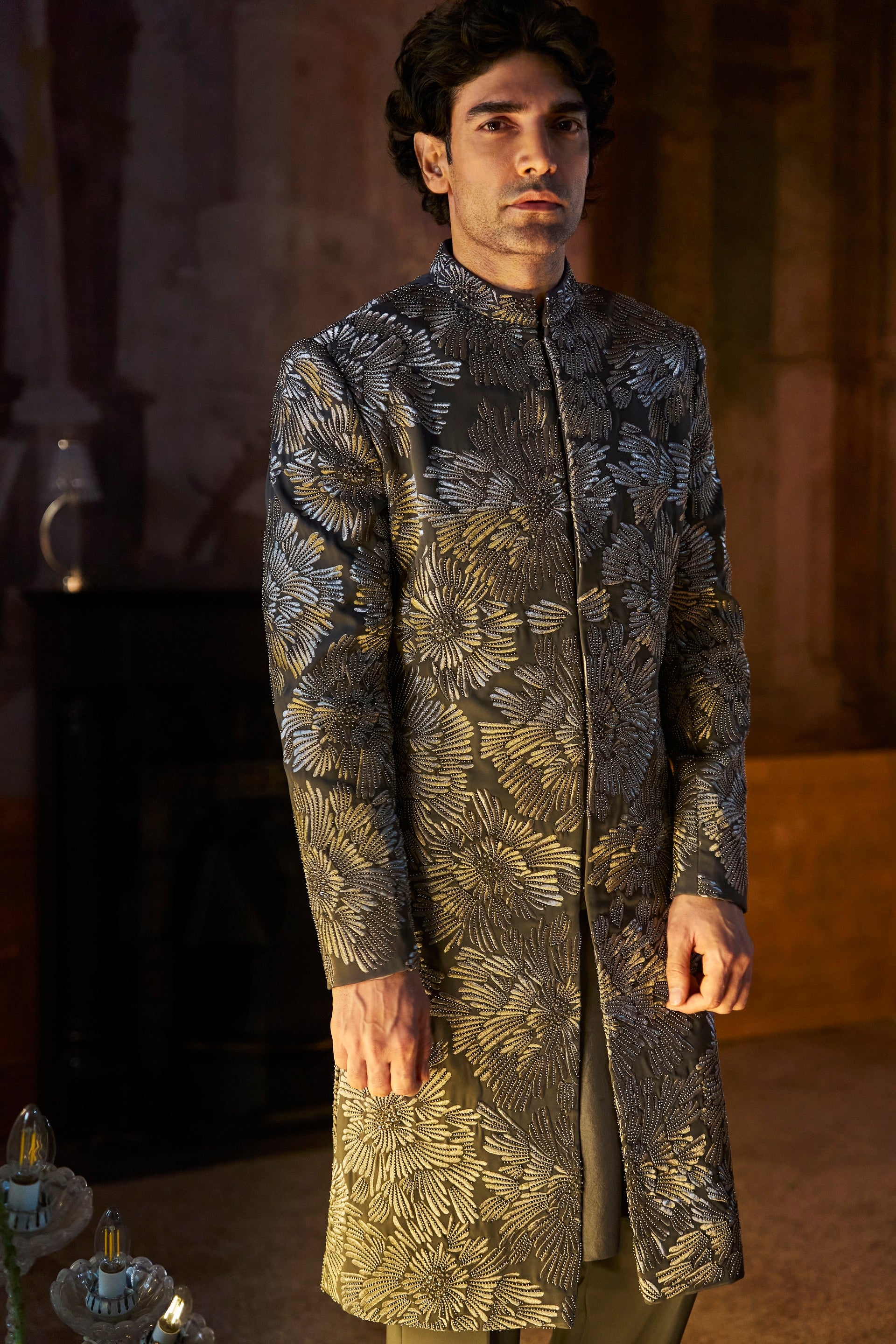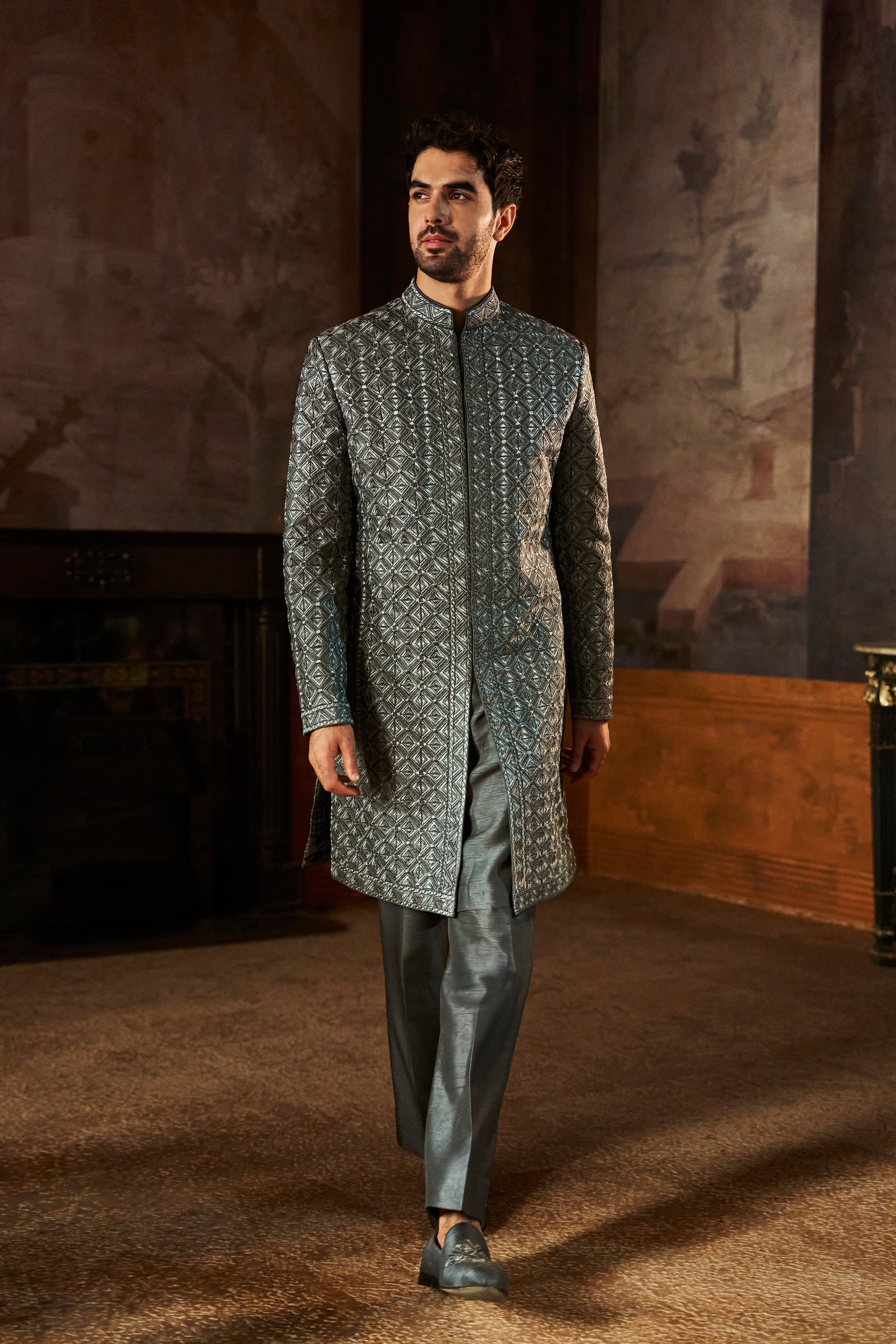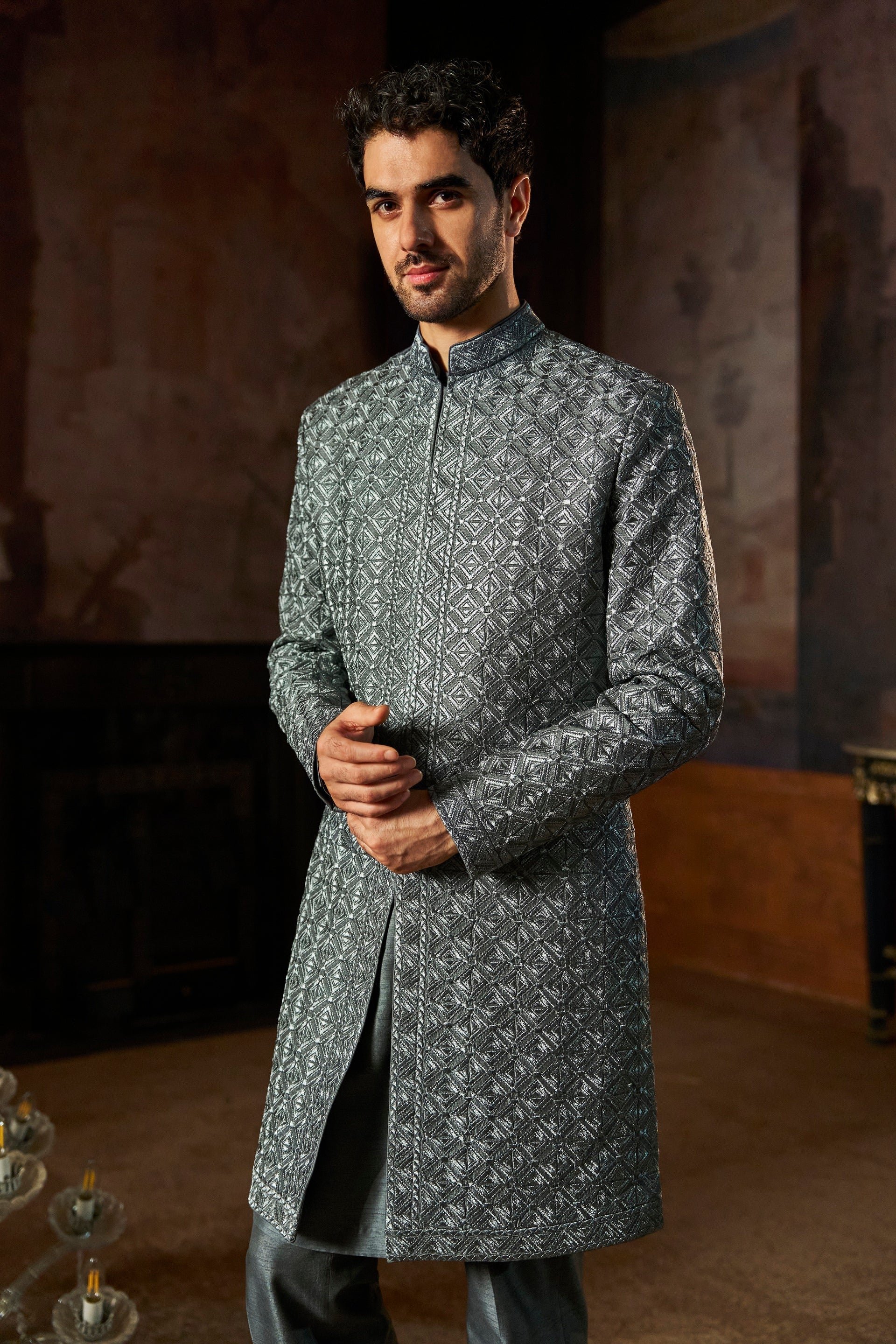 Grey Metallic Sherwani Set