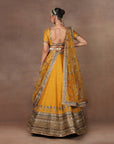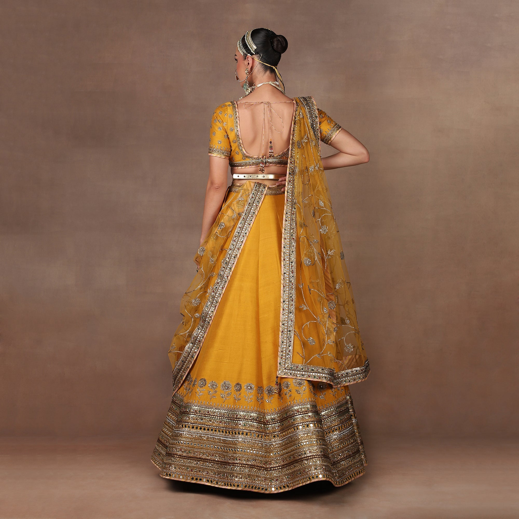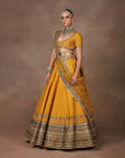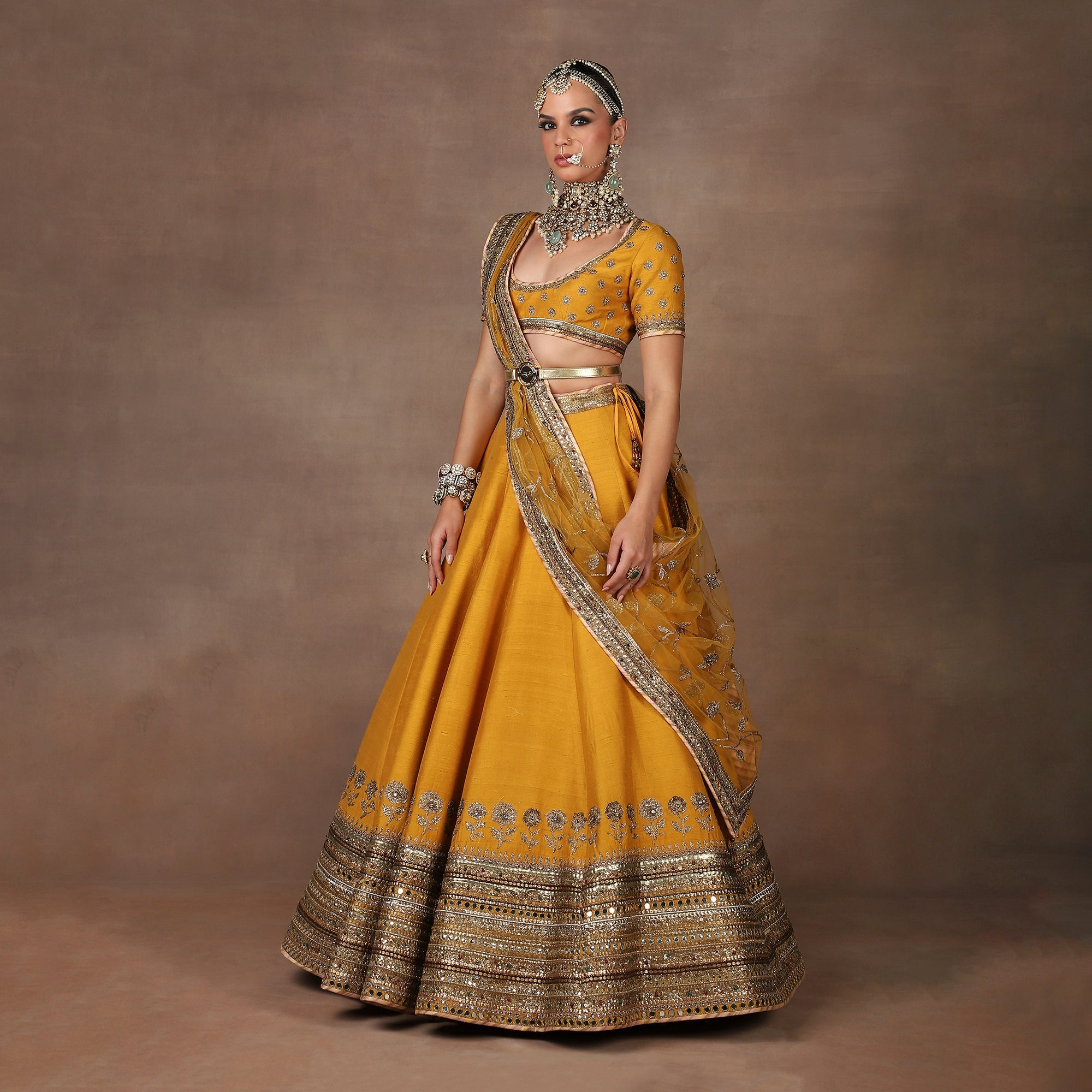 This lehenga set combines the rich warmth of amber yellow and gold, featuring antique gold metallic embroidery, crystals, and sequin work. The design is enhanced with jeweled embroidery and intricate Kasab detailing. Paired with an embroidered tulle stole, it exudes a regal, refined charm.NOTE: The belt and jewelry are not a part of the set and are used only for styling.
