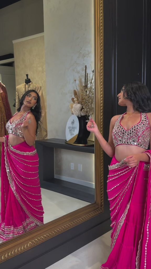 Featuring a saree with intricate mirror work embroidery. The saree drape showcases diagonal sequin embellishments. The halter-style blouse, adorned with mirror detailing and delicate hand embroidery, complements the saree's design. The intricate border work along the pallu and hemline enhances the traditional appeal.