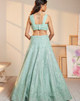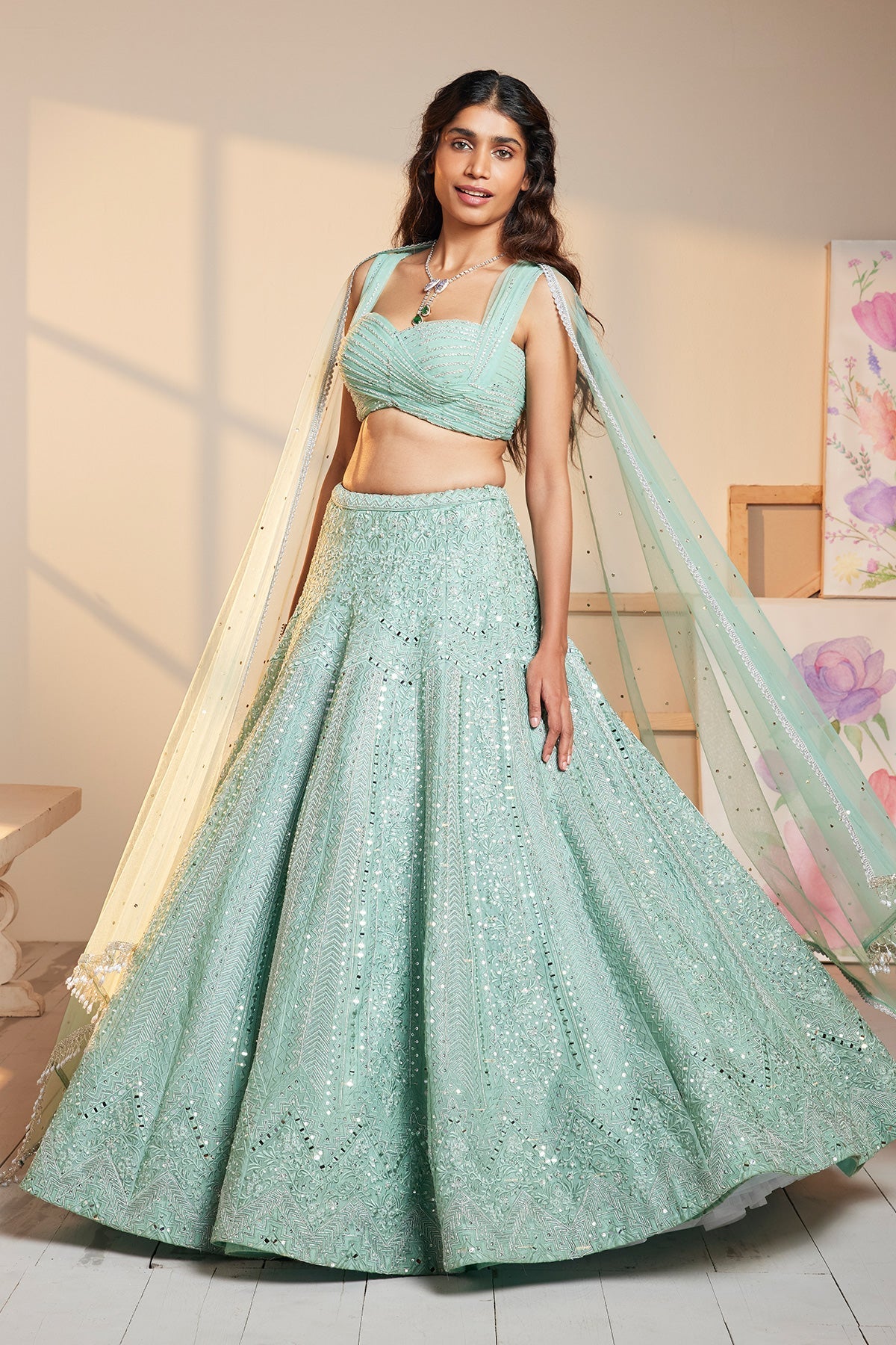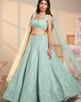 Organza-Base With Thread , Sequence And Mirror Embroidered Lehenga Paired With Sequence Embellished Ruched Blouse And Tulle Dupatta