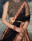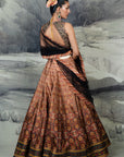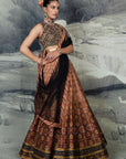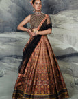 This stunning skirt set showcases heavy embroidery with antique metallic kasab and resham detailing, beautifully accented by shimmering sequins. The combination of intricate craftsmanship and luxurious materials creates an exquisite ensemble, perfect for any grand occasion.NOTE: The belt and jewellery are not a part of the set and are used only for styling.
