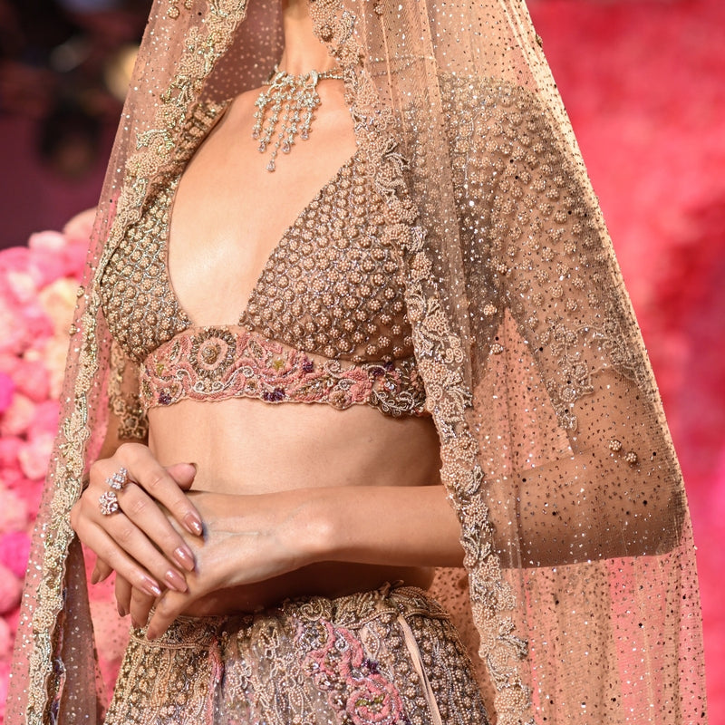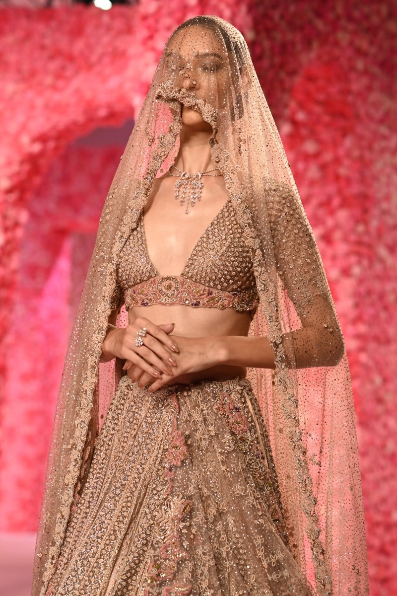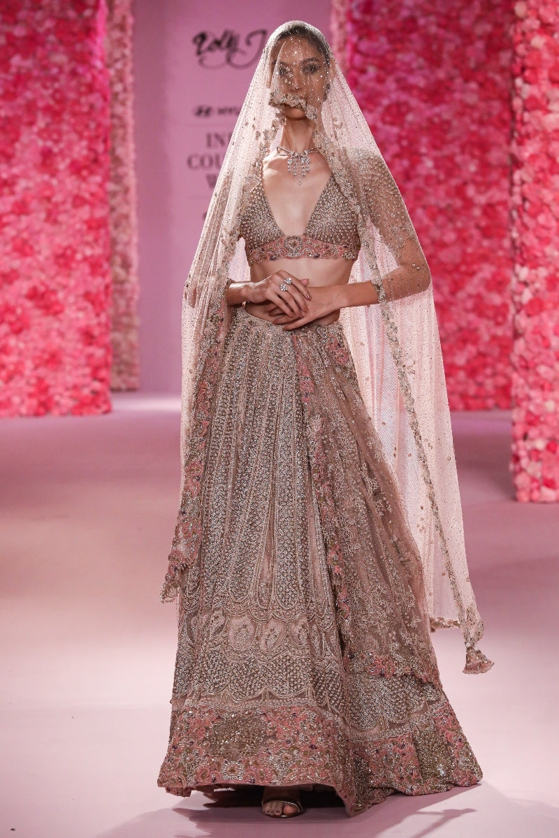 Rose Gold pearl beaded bridal Lehenga set paired with shimmer tulle veil dupatta and delicate thread work dupatta