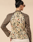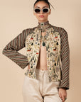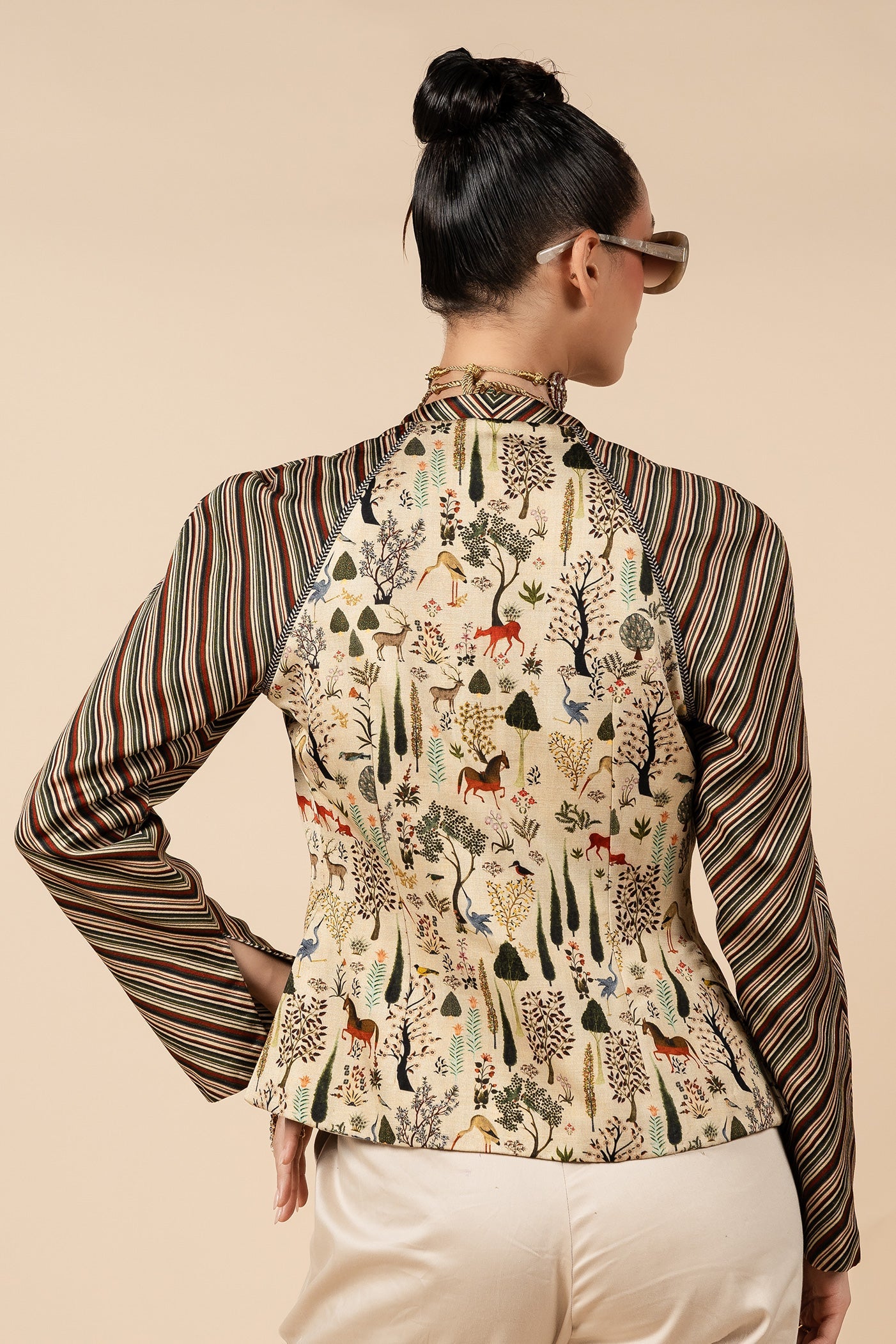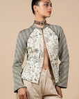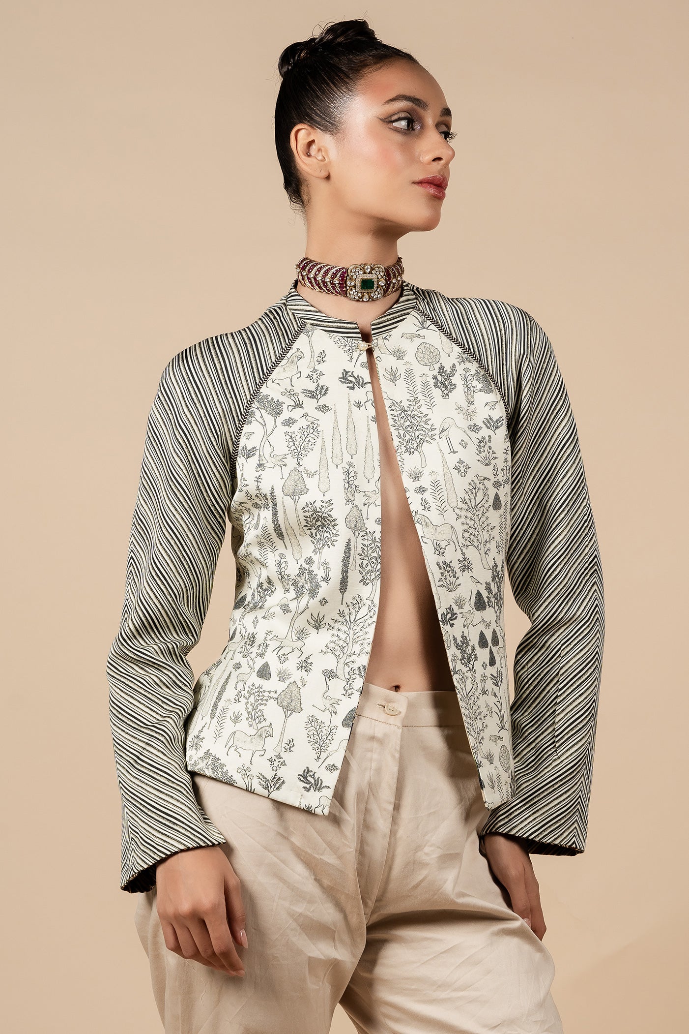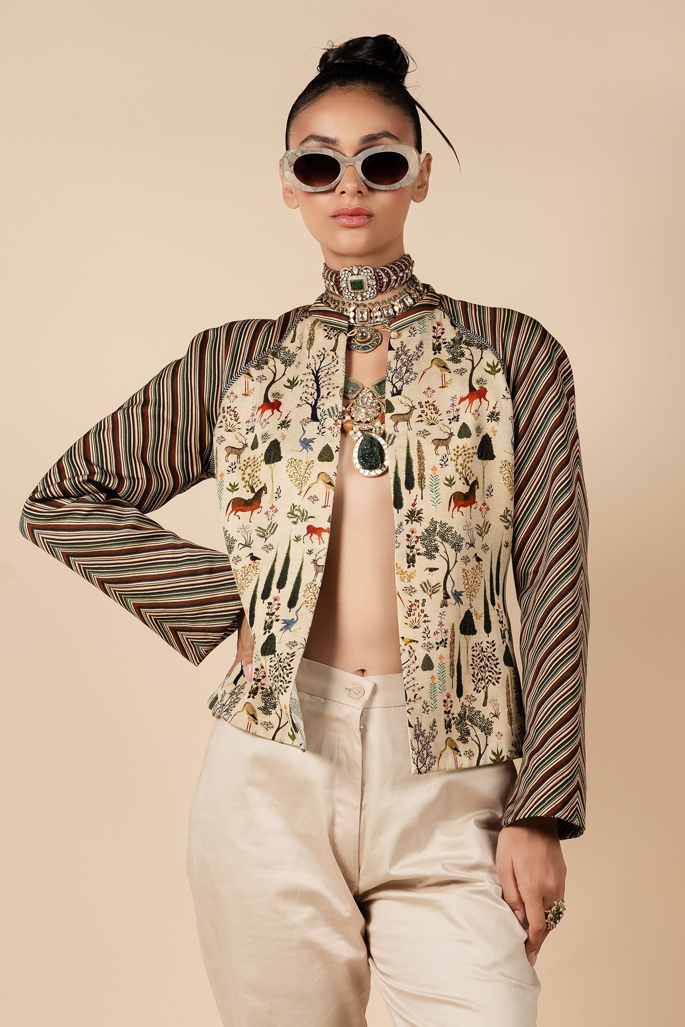 The Ika jacket in ivory colour is a versatile reversible piece that effortlessly enhances any outfit. One side features a vibrant multicolour stripe print on the sleeves, while the other showcases an elegant flora and fauna print. Made of satin linen, this jacket combines comfort with style, a perfect addition to your wardrobe. NOTE: The belt and jewellery are not a part of the set and are used only for styling