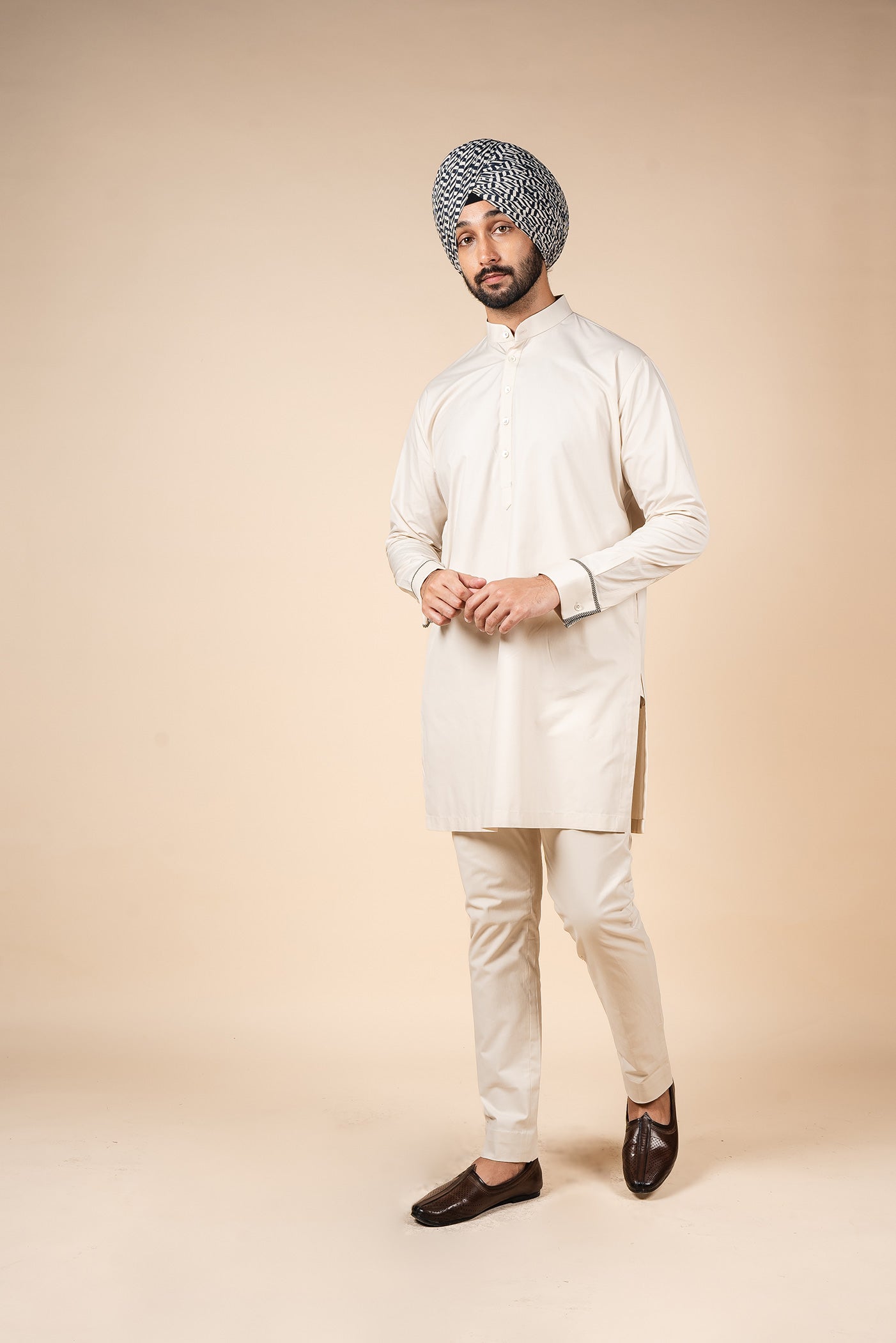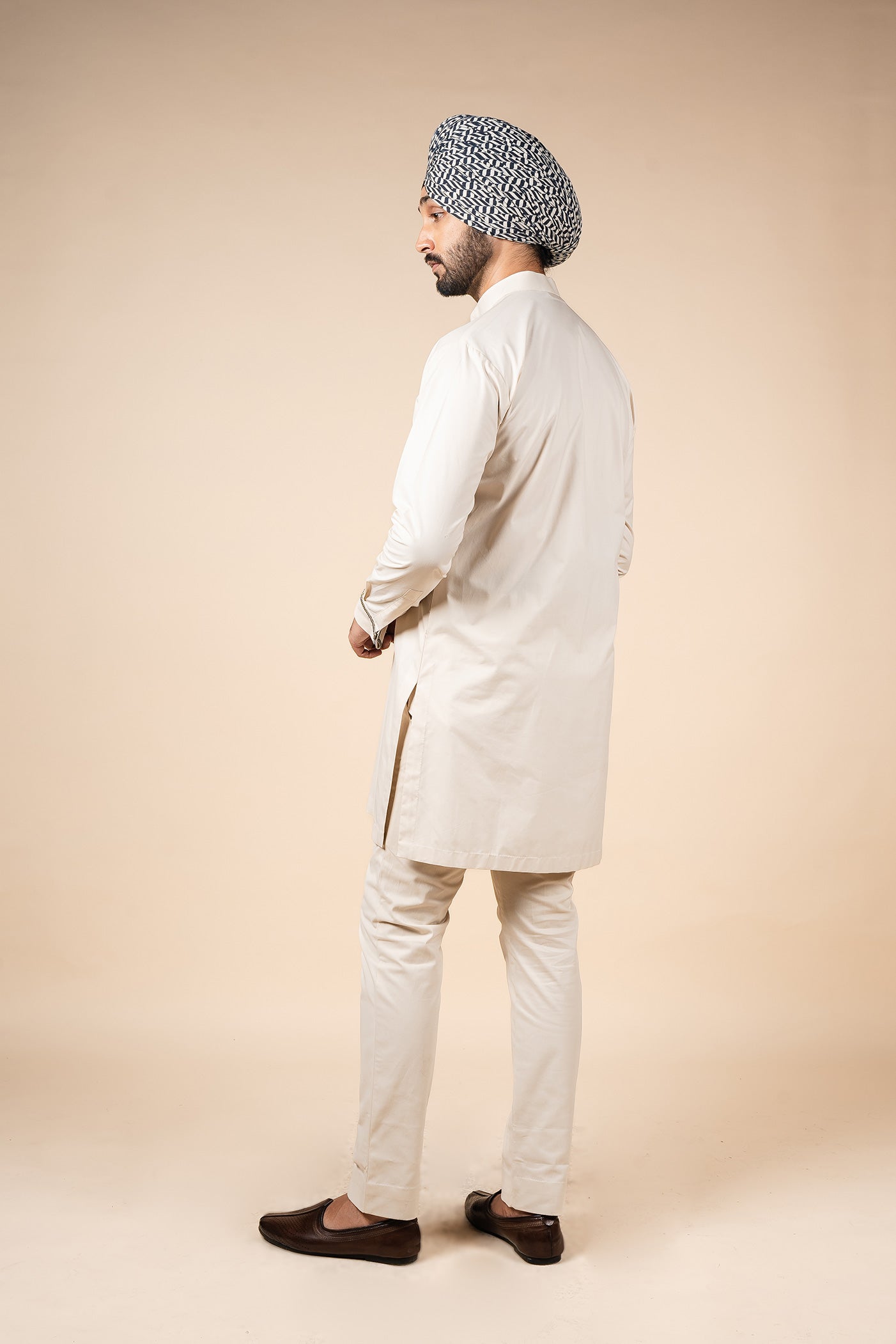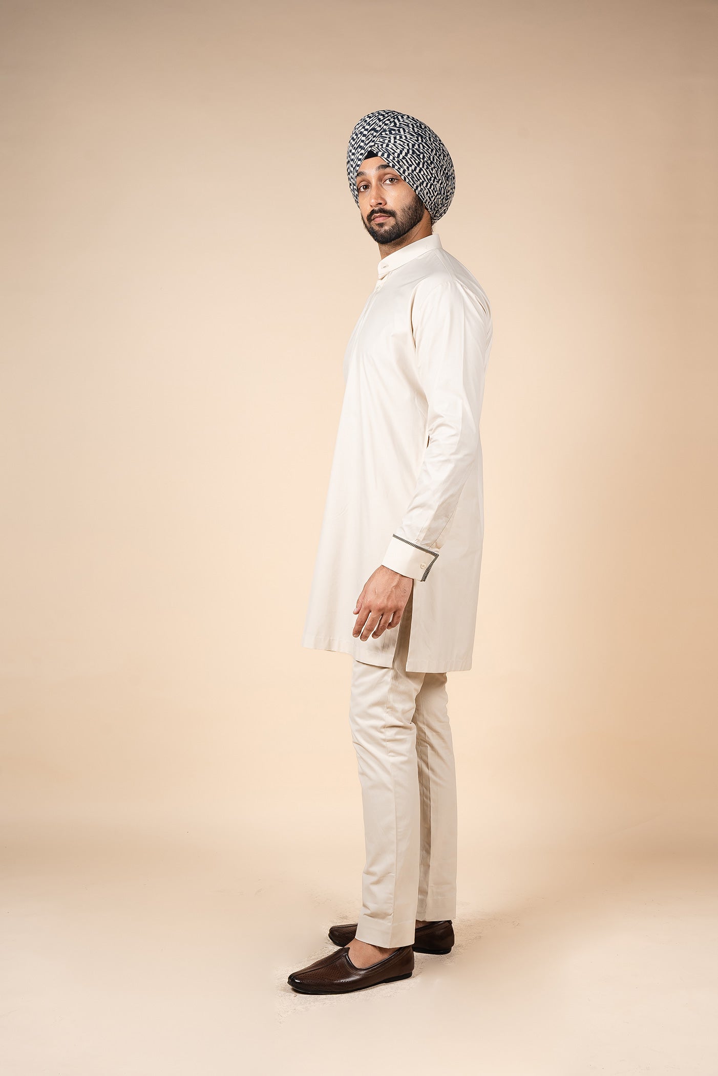 This ivory solid kurta is enhanced with Valaya's signature "The Shifting Leaves Chevron" detailing on the cuffs, adding a refined touch to its timeless silhouette.