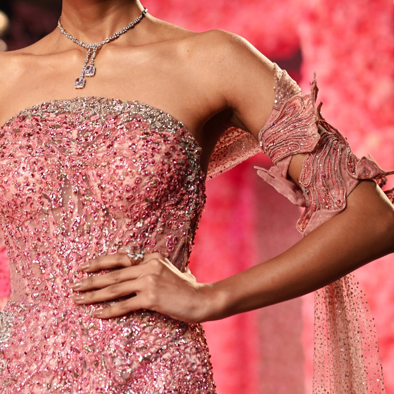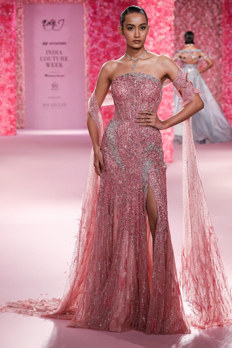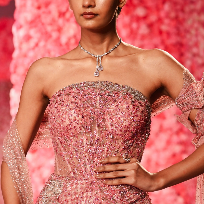 Candy Pink shimmer tulle embroidered Bustier gown paired with 3d leaf moulded arm cuff hand cape