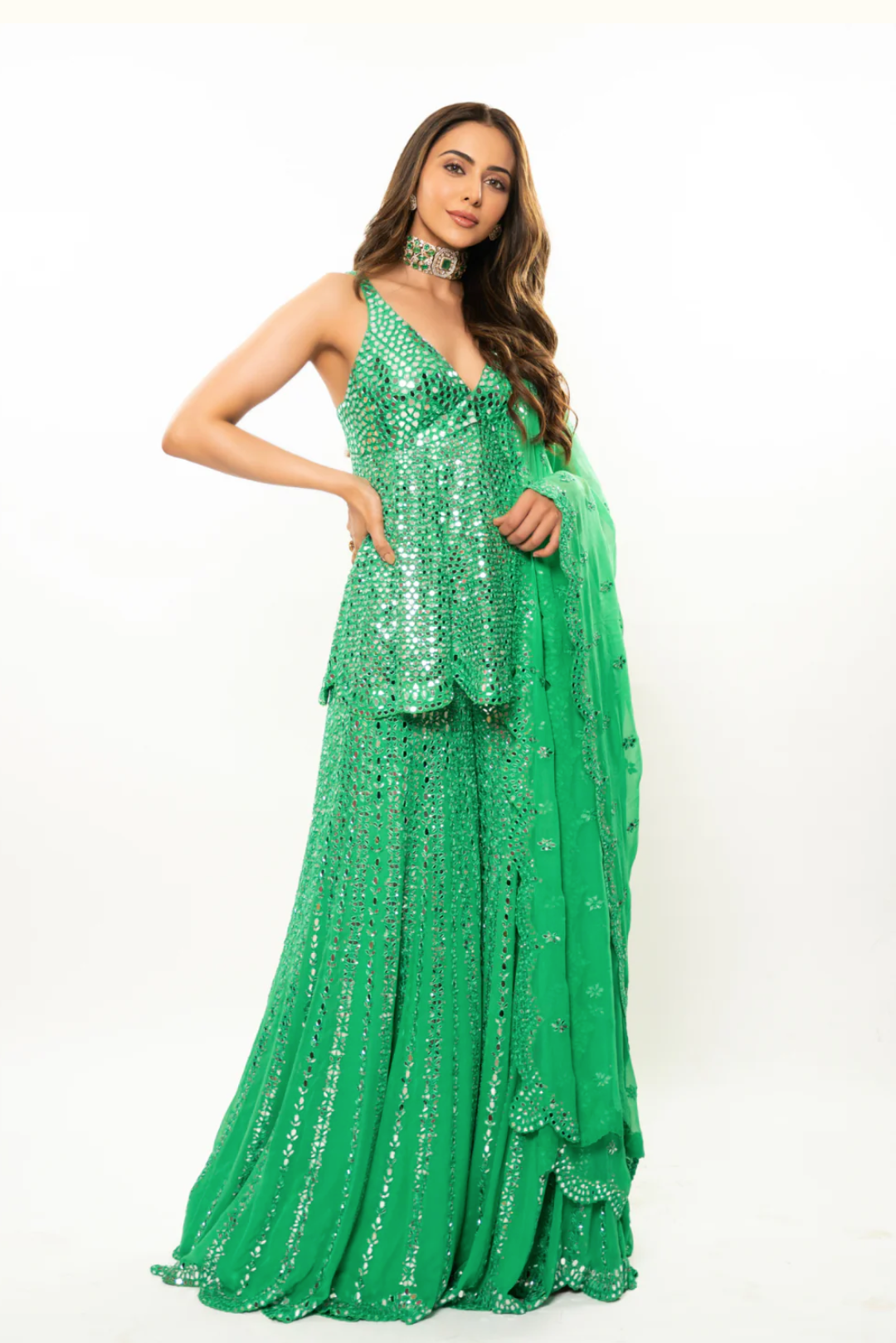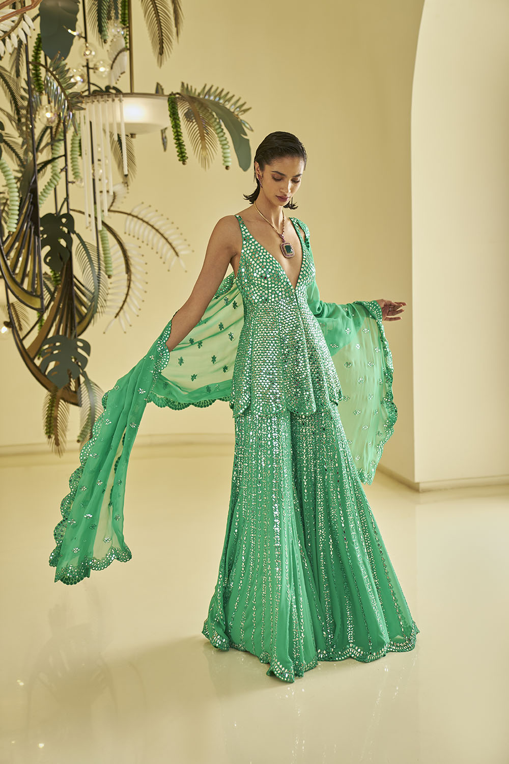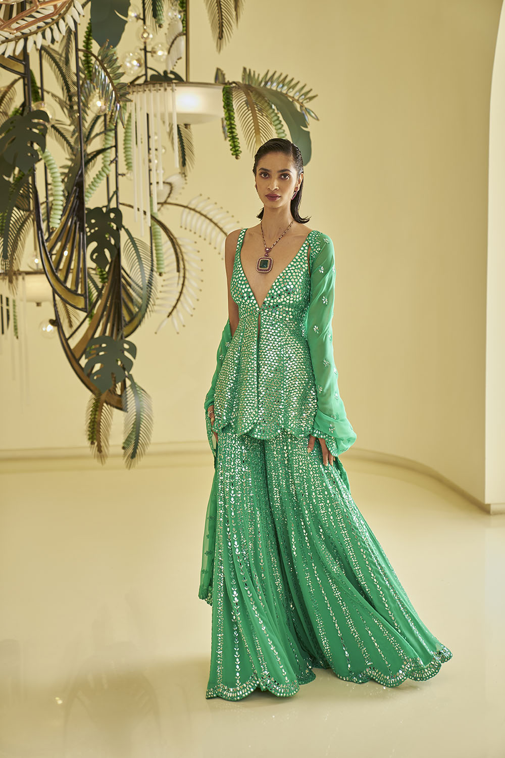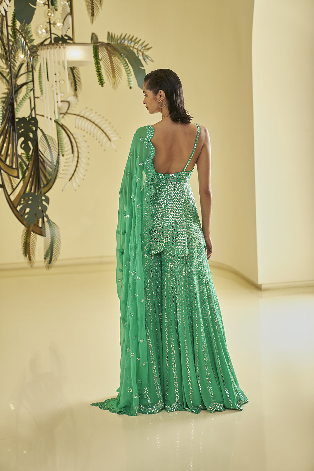 This green georgette sharara set features all over mirror work. The peplum top is paired with a scalloped dupatta.