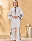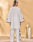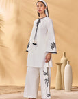 Tunic top- Tunic top- Split V-neck with tie-up with tassels attached| Bell sleeves | Khadi print on sleeves. Trousers- Straight pants | Side zipper closure