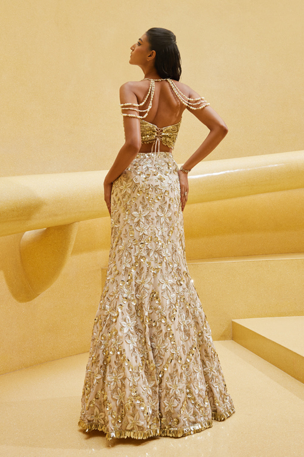A fit to flare ivory skirt with off white thread embroidery highlghted with champagne and silver zardosi and sequins, matching bustier blouse.