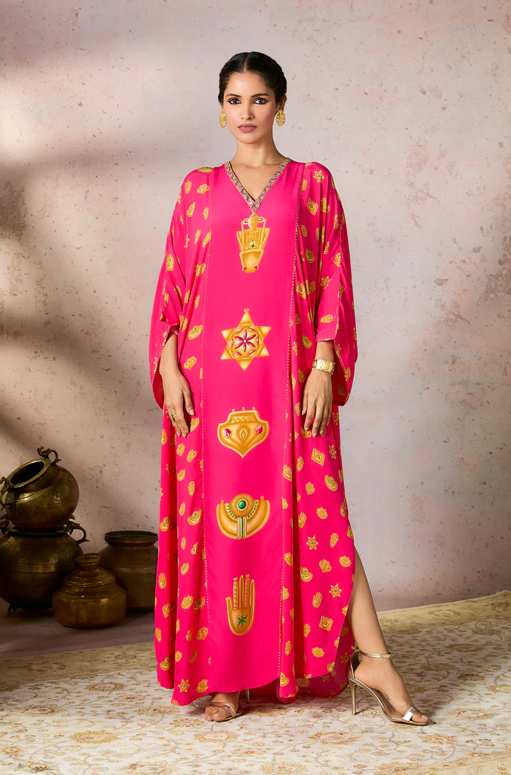 | EMBROIDERY | Kaftan- Pink Trinkets patchwork kaftan adorned with embroidered border and kinari gota | Asymmetrical elbow sleeve | 'V' neckline | |