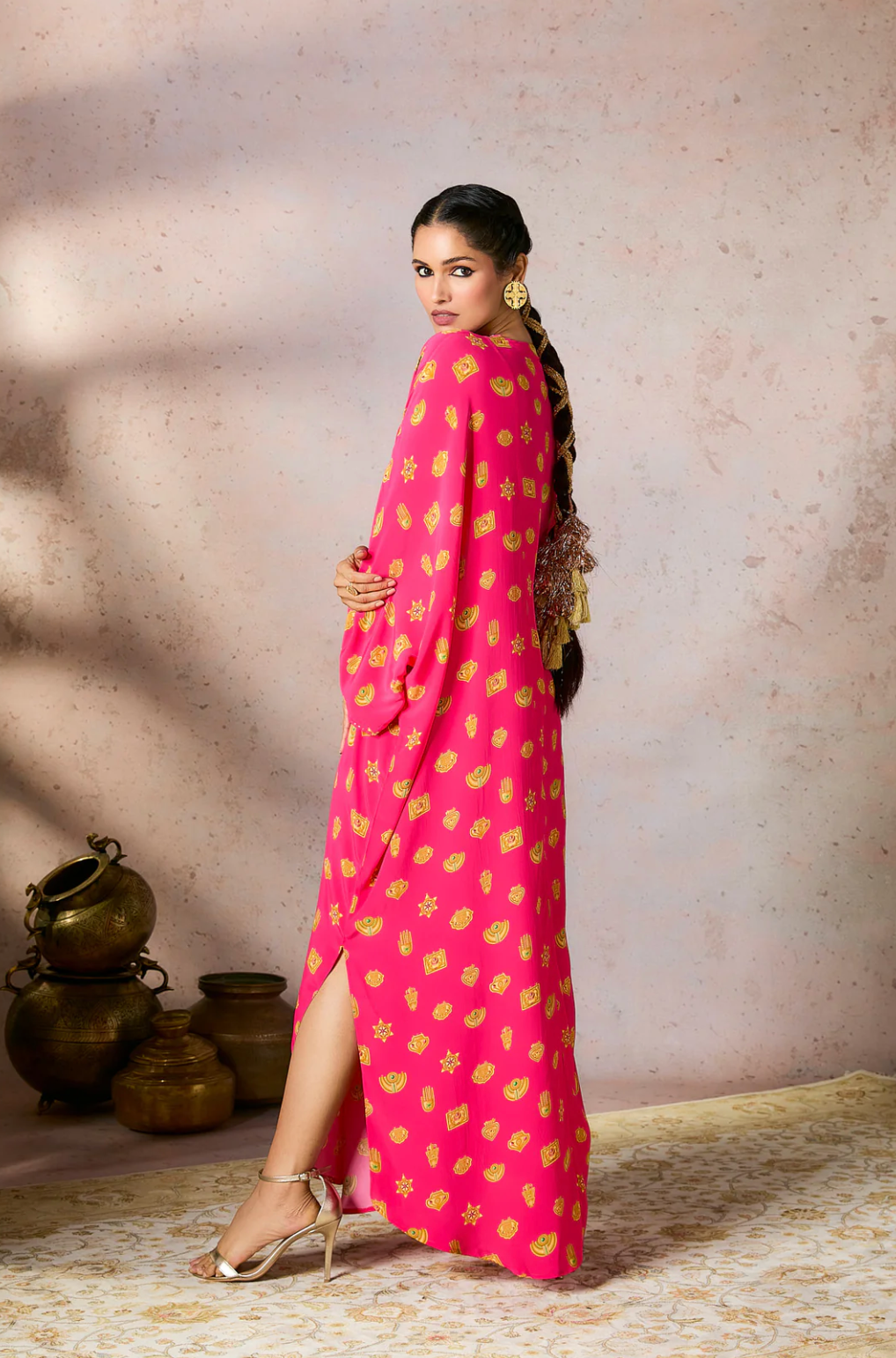 Kaftan- Pink Trinkets patchwork kaftan adorned with embroidered border and kinari gota | Asymmetrical elbow sleeve | 'V' neckline |