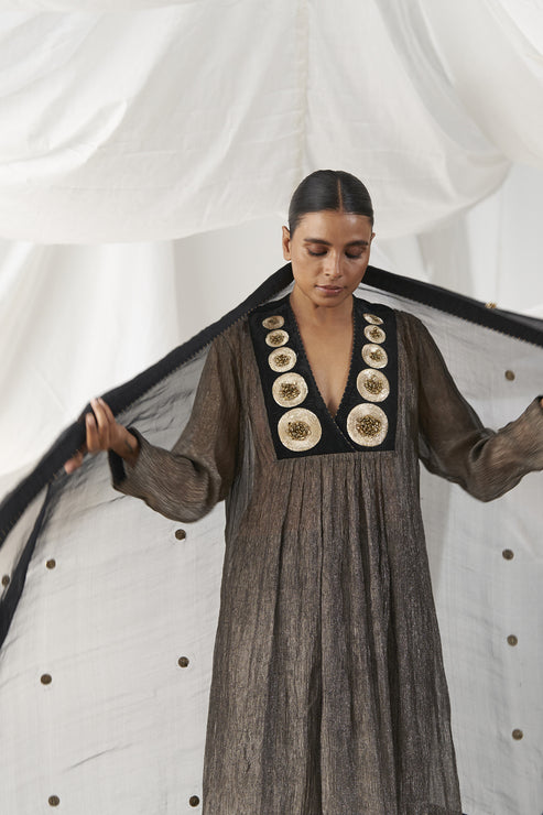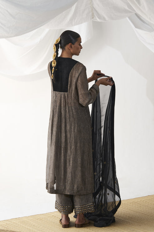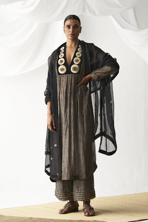 Black kurta with embellished antique dot embroidery on neckline paired with ghunghroo detailed culotte pants and organza dupatta