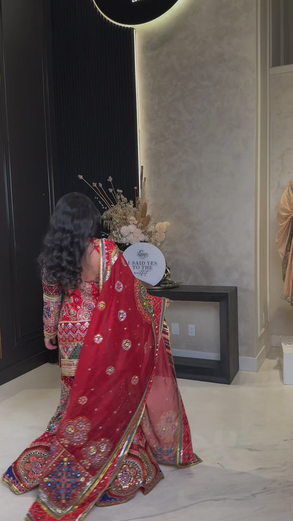 This striking red Mayyur Girotra sharara set, crafted from rich Chanderi silk, embodies timeless elegance with a festive flair. The ensemble is beautifully embroidered with traditional gota work, creating a luminous interplay of texture and sheen. The flowing sharara silhouette paired with the radiant red hue makes it a perfect choice for pre-wedding festivities and celebratory occasions. Exuding sophistication while honoring artisanal craftsmanship, this set is designed to make a lasting impression.
