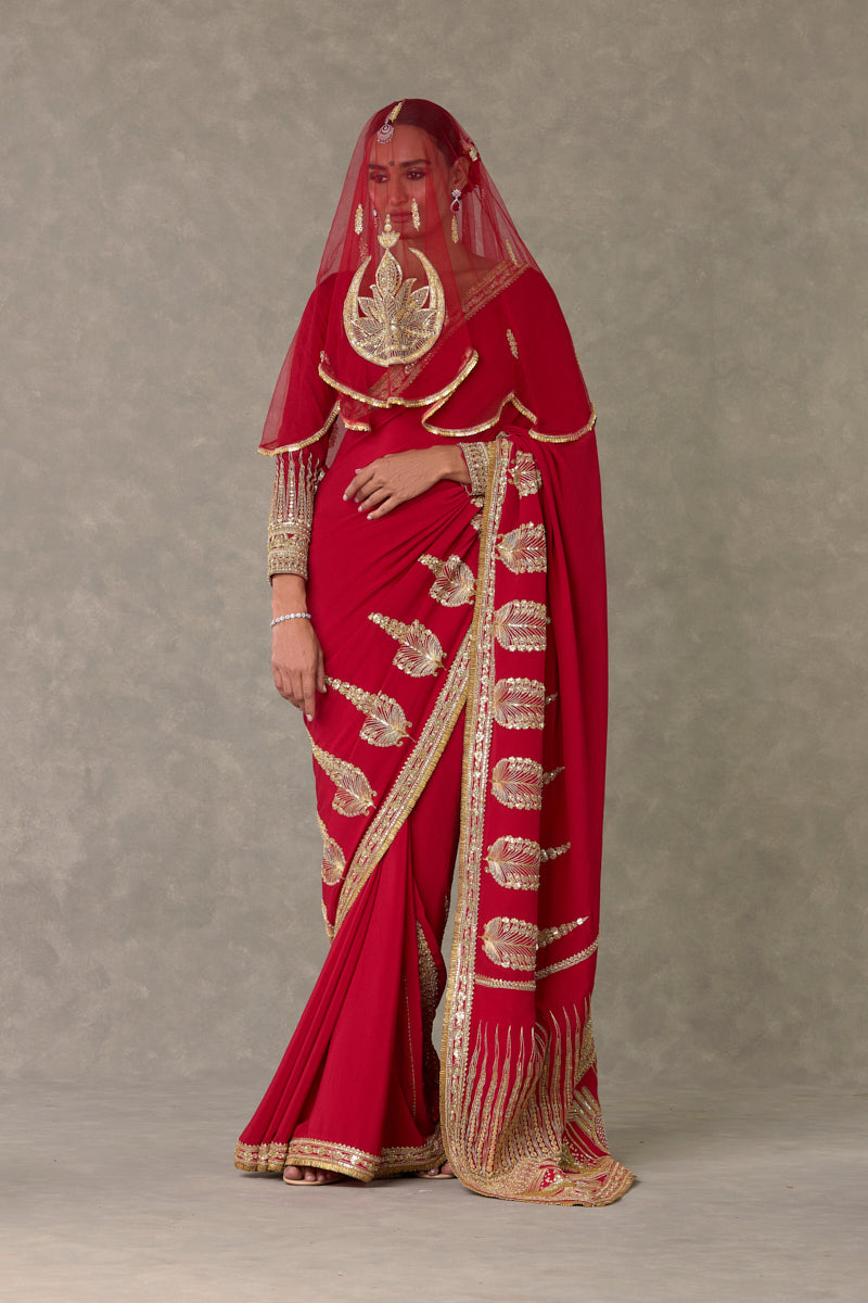 | EMBROIDERY | Saree - Palla intricately embroidered with signature motifs - Son-Patti, Son-Chidiya & Trikone in dori and sitara kaam |Embellished with embroidered borders | Printed backing Blouse piece - Trikone embroidered blouse piece Veil - Sheer veil intricately embroidered with signature Chaand-Phool motif in sitara and pita kaam along with madakal finish |