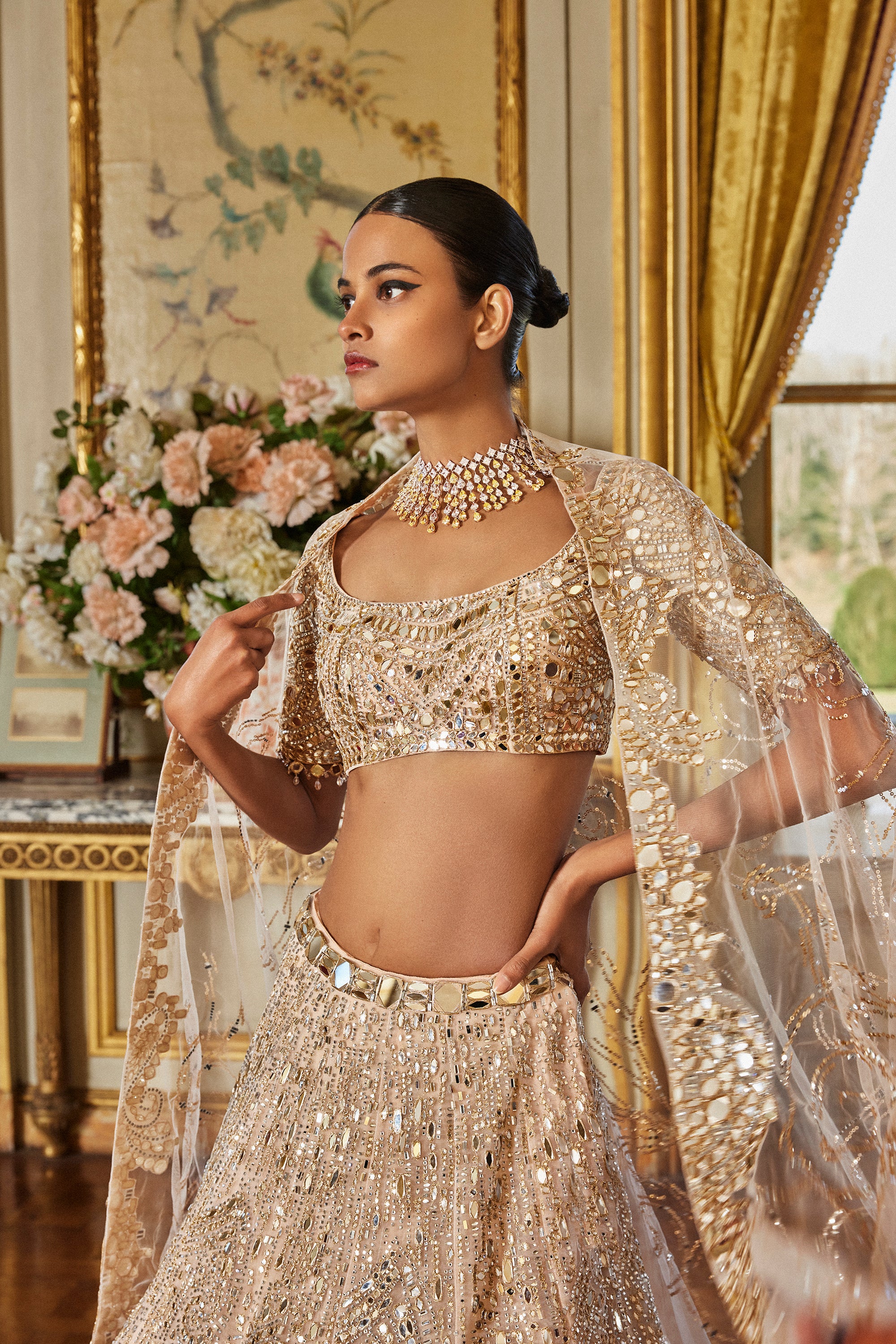 This lehenga set features intricate embroidery in rose gold thread and mirror. It is paired with an embroidered blouse and an all over jaal dupatta.