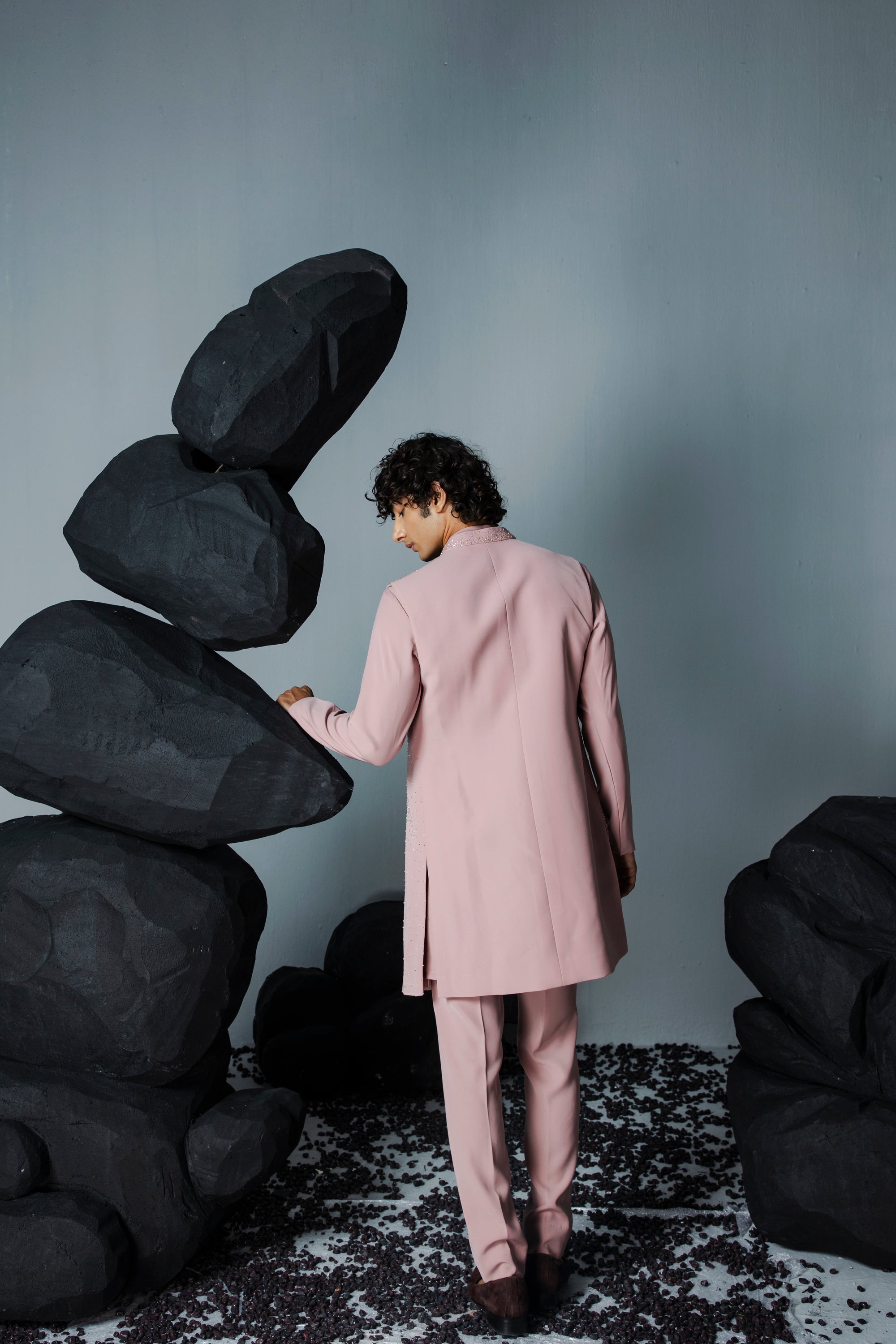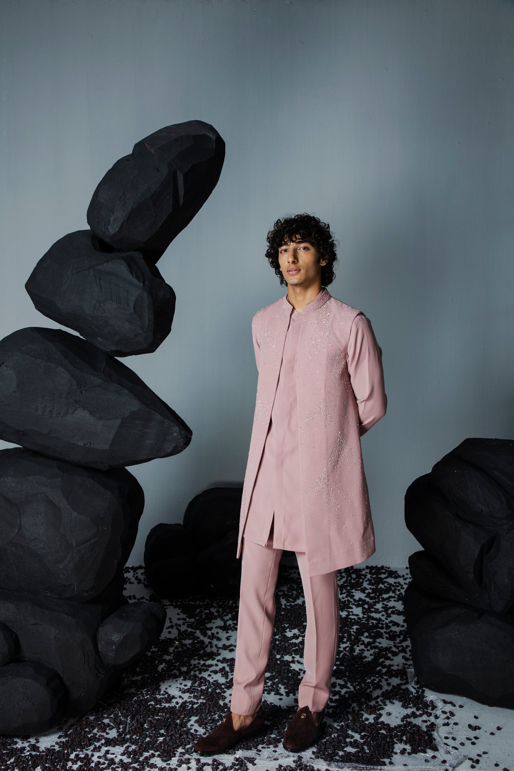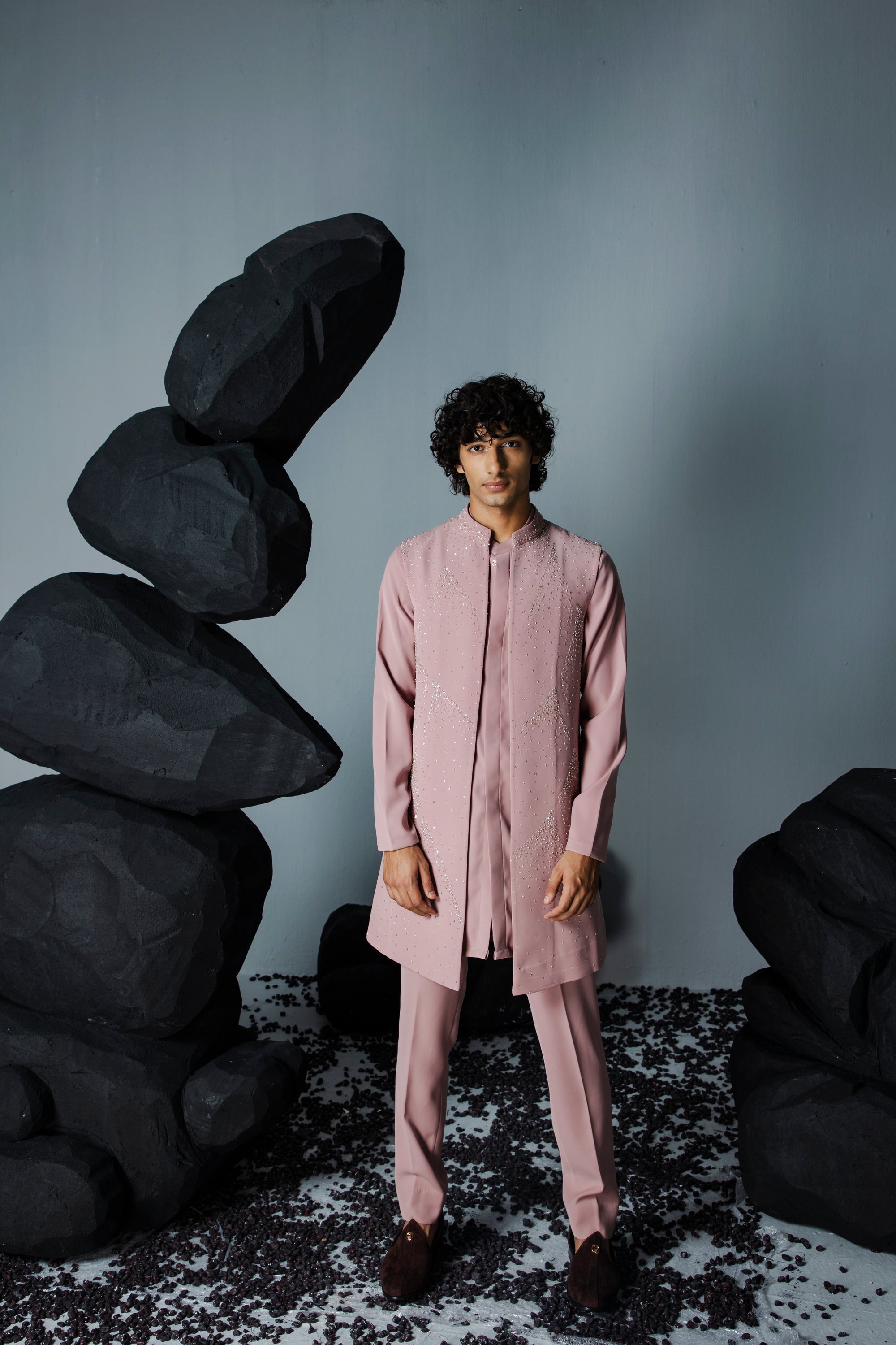 A subtle shrug set with scattered embroidery all over the jacket, paired with matching kurta and pants