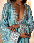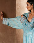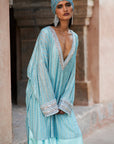 Ice blue striped tunic with stone-embellished embroidered yoke, paired with a ice blue solid satin skirt along with a matching headgear accessory.