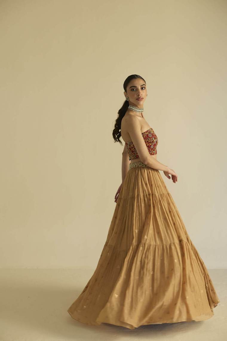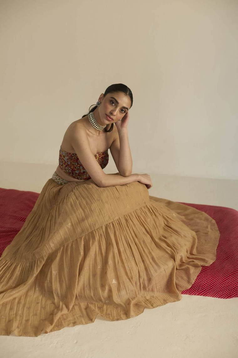 Hand Embroidered Tube Croptop Teamed With A Tiered Lehenga In A Classic Beige.