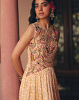 Hand embroidered waist drop maxi dress with intricate hand work in an earthy colour palette.