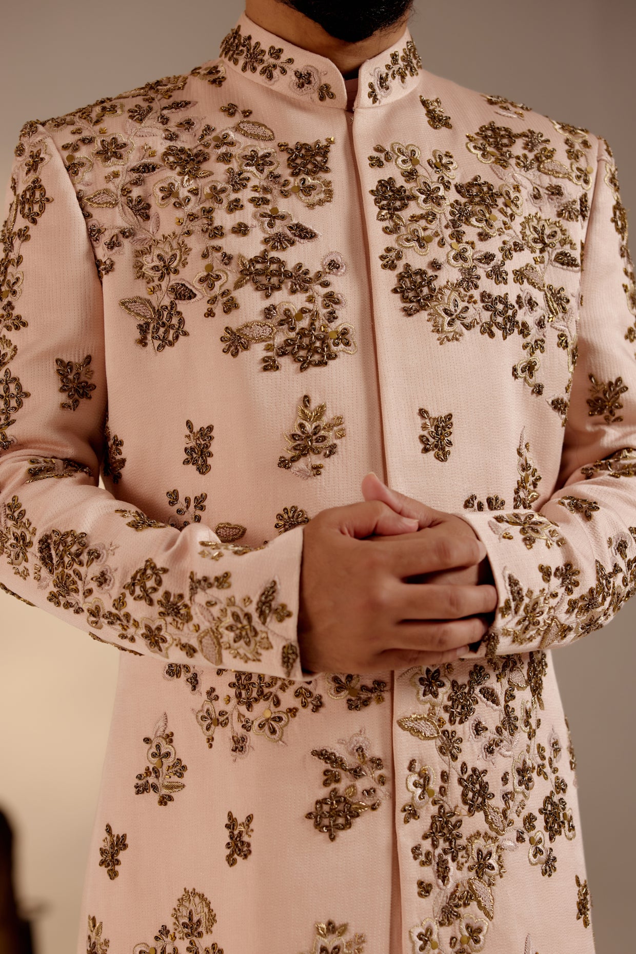 Featuring our work of art in our hand-embroidered shell-pink sherwani with a 3-tier embroidery process. The foundation is crafted using tone-on-tone thread and zari texture, the second tier is a layer of shell-pink resham work and the third tier is highlighted with 3-d elements, dabka and zari. Paired with a hand-embroidered shell-pink stole and pag.