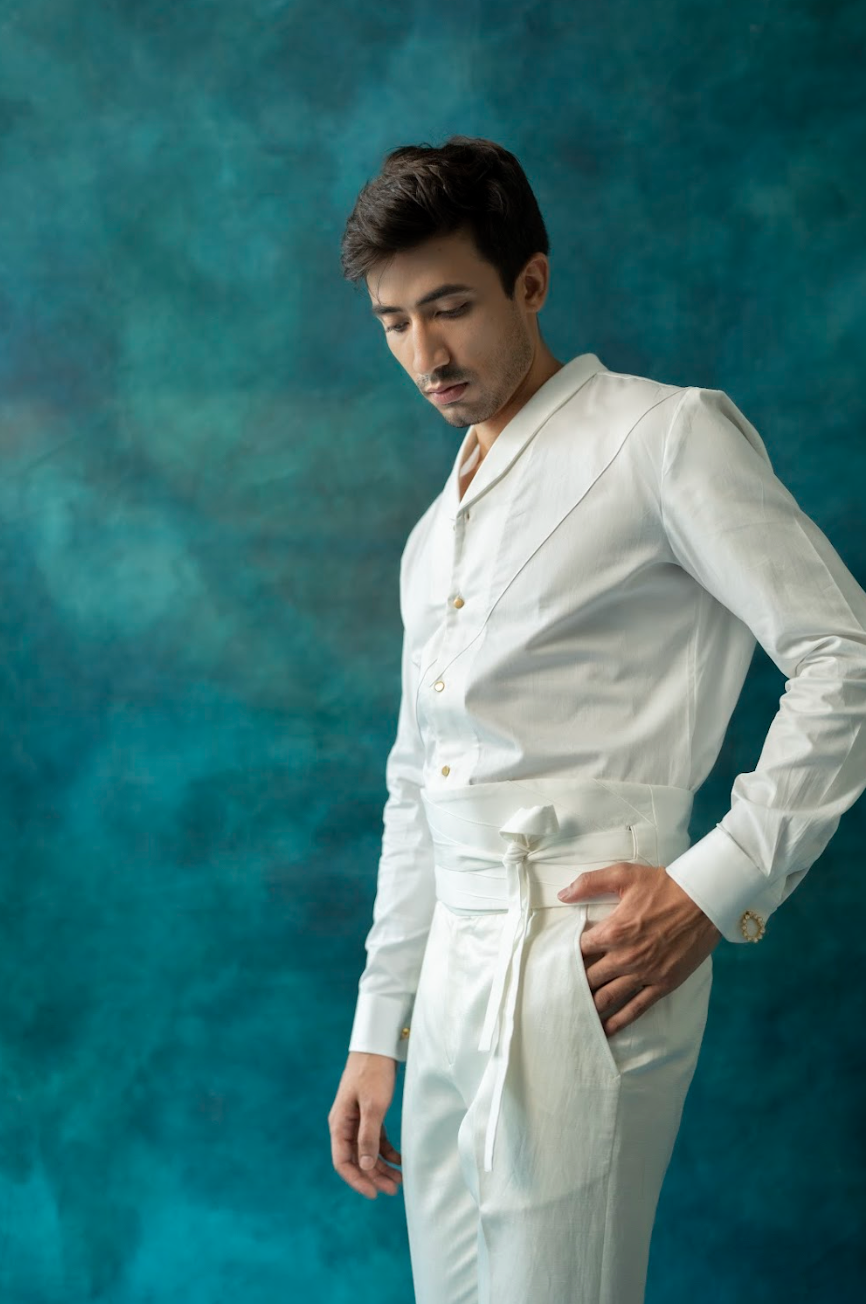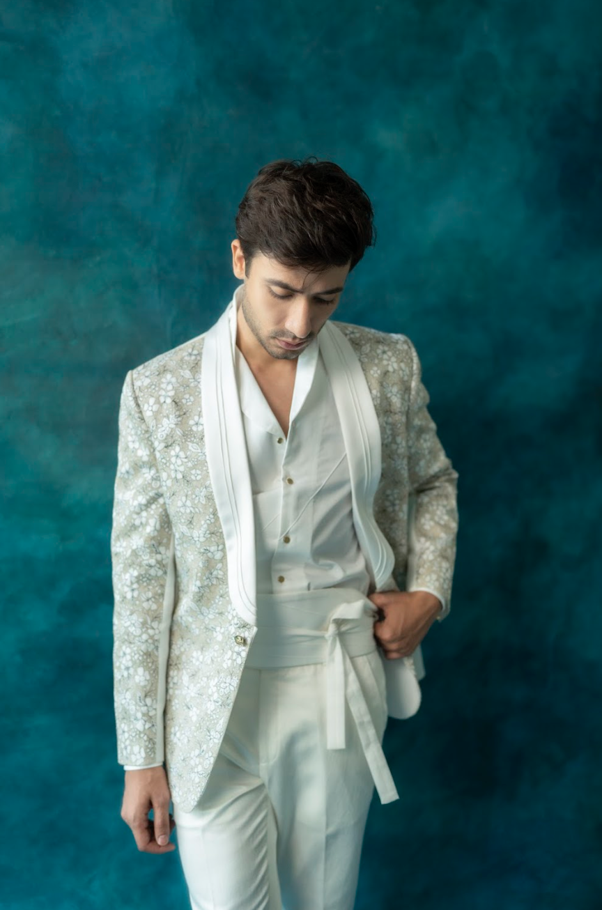 Presenting White Iris Tuxedo on a linen silk base with floral embroidery all over using light gold zari and a contrasting black color. Paired with a crisp white pintuck shirt and tapered trousers.
