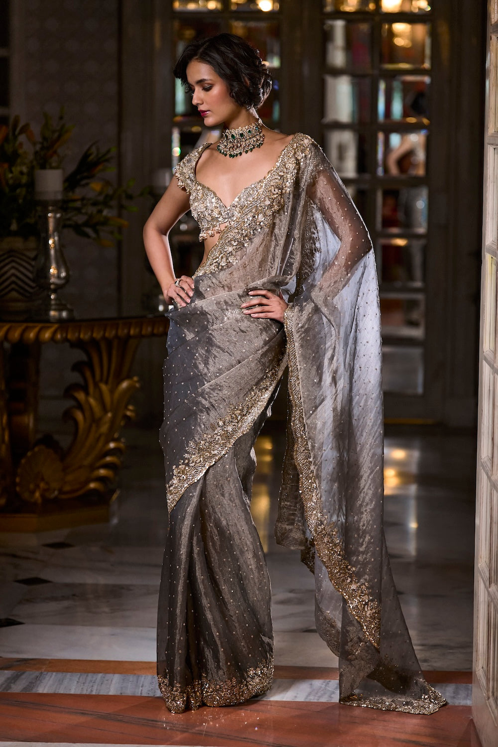 This saree features intricate embroidery in sequin, bead and crystal in antique tones on a stone grey tissue silk base. The contrasting cap sleeve blouse has tassels at sleeve hem as well as at the waist.