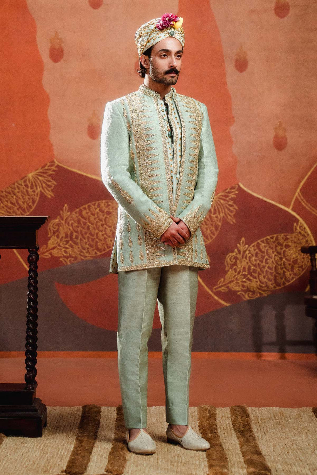 Ornate gold embroidery comes to life in The Kashni Raja koti inspired by 'Amaltas'. In a relaxing hue of sage green and embelished with heavy gold work that consists of zardozi, katdana and pearl work. With a short kurta and smart pants- this Raja koti is fit for a king indeed.