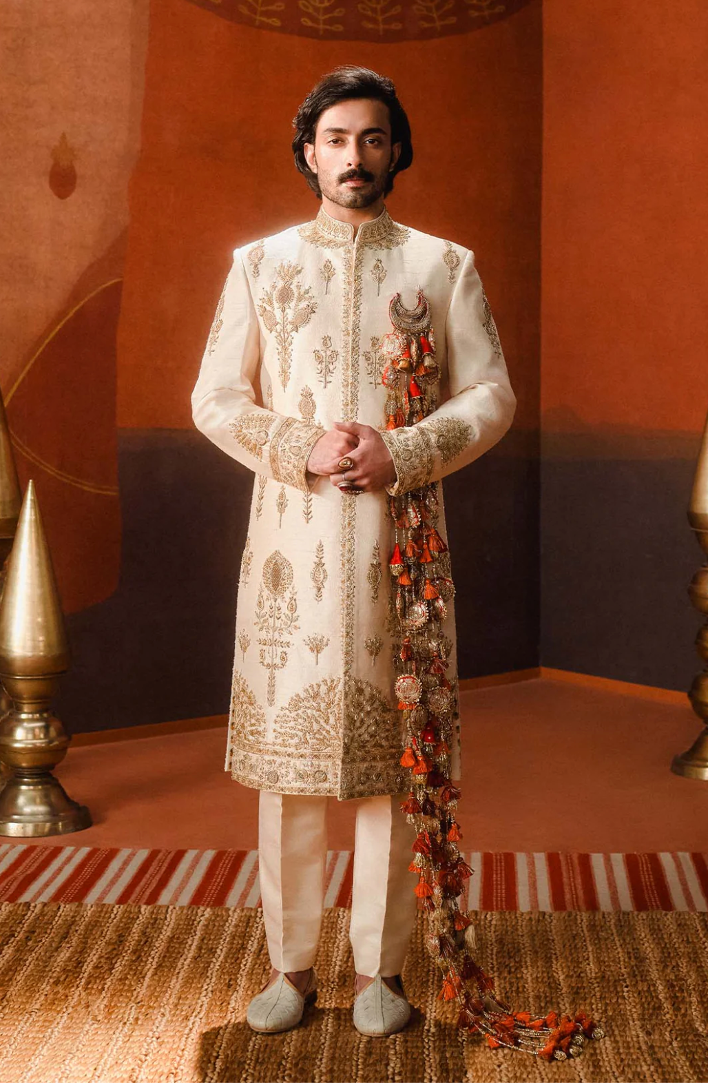 | FABRIC | Sherwani- Heavy Raw Silk | Kurta- Dupion | Pant- Heavy Raw Silk | Stole- Brocade |