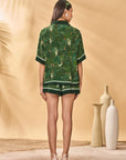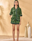 Shirt- Relaxed shirt | Printed border detail | Front button closure. Shorts- Side zipper closure | Side pockets.
