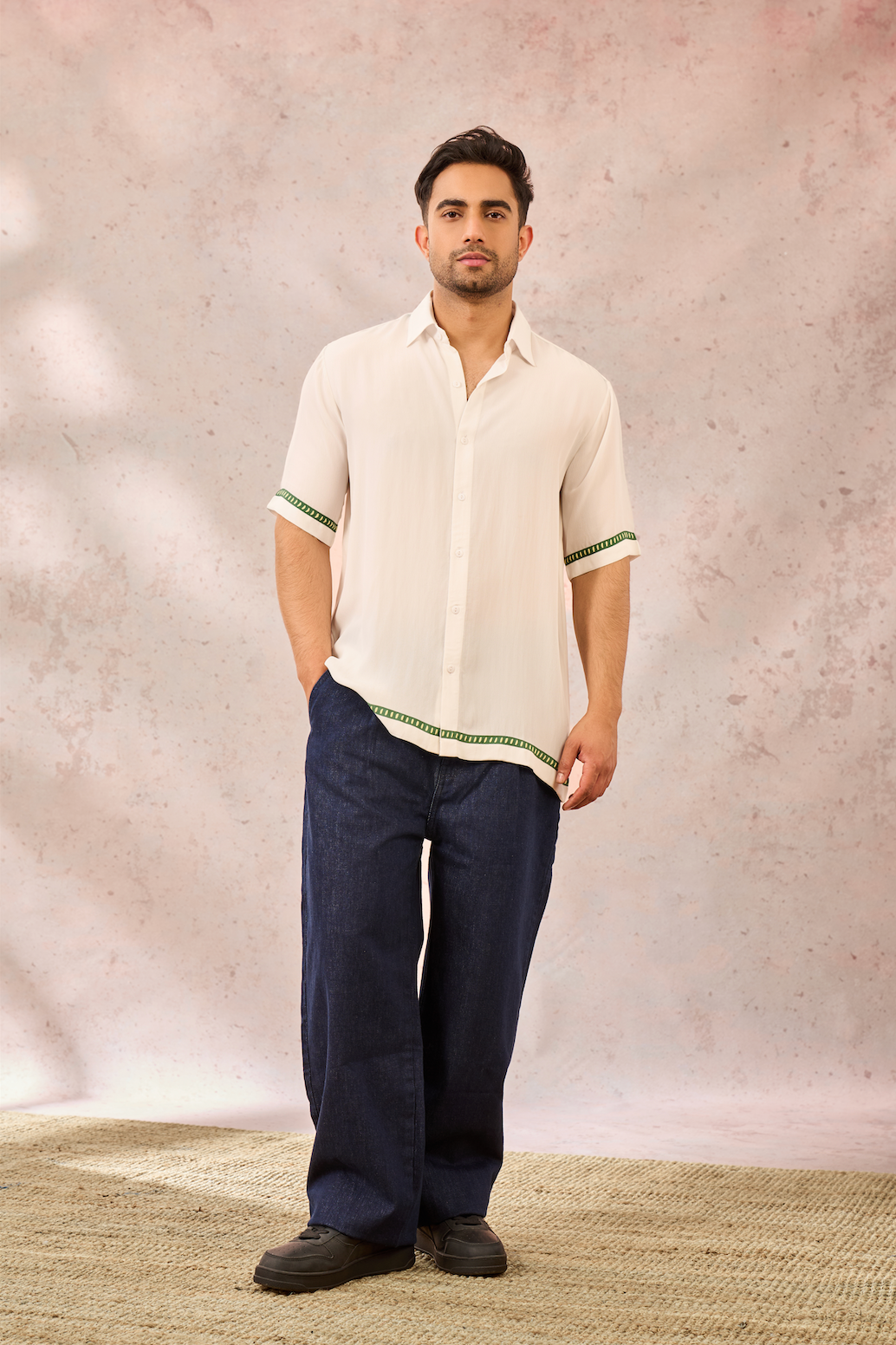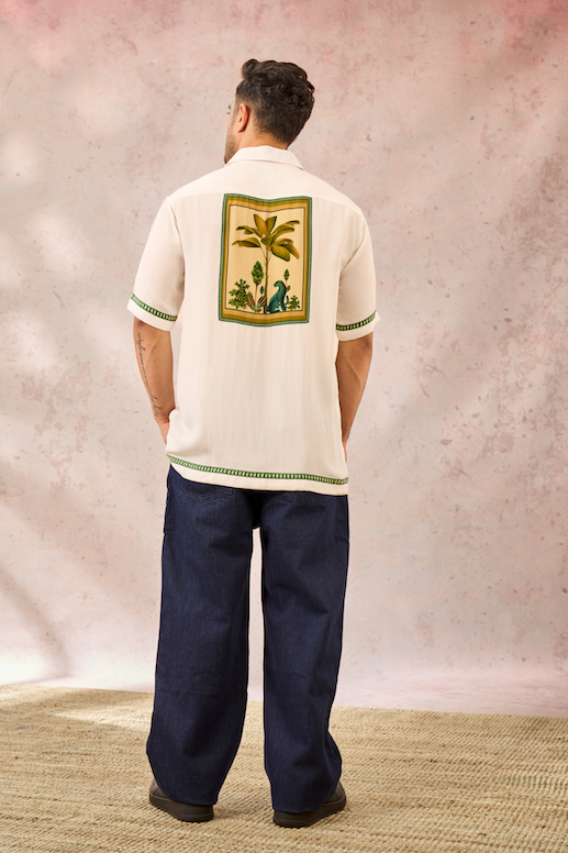 Shirt with digital print patch at the back | Standcollar | Front placket | Hem and sleeves are adorned with printed border | Gold Toffee button attached to the side seam